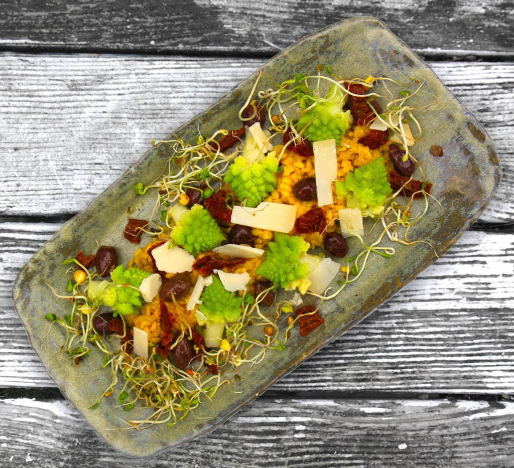 Für 2 Portionen: Einen halben Romanesco in Röschen teilen. einen breiten Topf mit reichlich Wasser, 1 TL Salz und 1 TL Natron zum Kochen bringen und die Röschen ca. 1 Minute kochen. Dann kalt abschrecken damit sie nicht weiter garen. Den Strunk vom Romanesco und 1/2 Zwiebel fein würfeln und in 1 EL Olivenöl anschwitzen. 1 Tasse Paella-Reis dazu geben und ca. 1 Minuten mit anbraten, dann mit einem Schuss Weißwein ablöschen. 1/2 Tassen Gemüsebrühe und 1 Messerspitze Safran sowie etwas Salz zum Reis geben. Mit geschlossenem Deckel bei wenig Hitze ca. 20 Minuten garen. 5 getrocknete Tomaten hacken und ca. 10 dunkle Oliven (Kalamata) halbieren. 50g Parmesan oder harten Ziegenkäse fein hobeln. Das Gemüse mit dem Reis auf Tellern anrichten, mit dem Käse bestreuen. Nach Belieben noch einmal kurz mit Oberhitze im Ofen überbacken oder mit frischen Sprossen servieren.