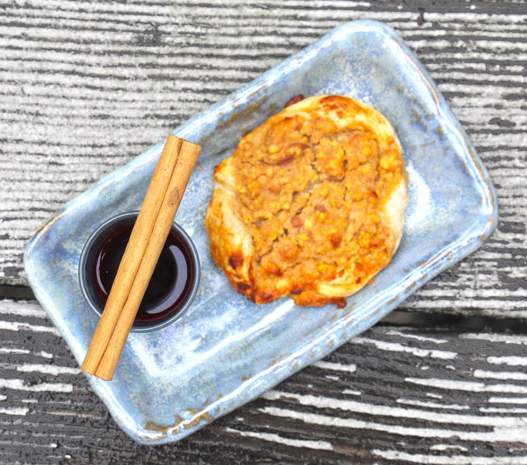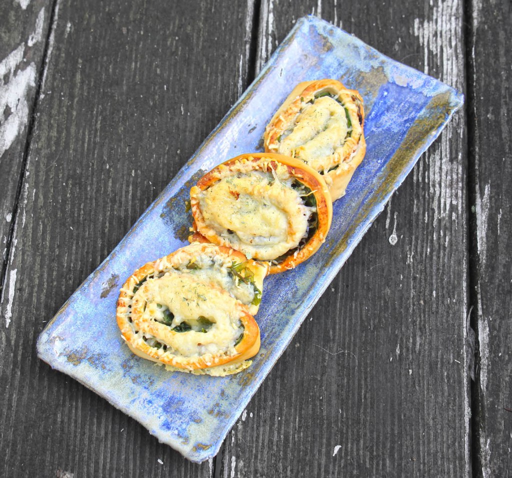 Für ca. 8 Schnecken: 2 säuerliche Äpfel entkernen und in Stücke schneiden. Mit 200g Marzipanrohmasse, 2–3 Spritzern Rum-Aroma, 2 EL Doppelrahm-Frischkäse sowie 1 Ei in einer Küchenmaschine mittelfein pürieren. Mit Zimt, Vanille und 1 Messerspitze Nelken würzen. 1 Rolle Dinkelblätterteig (aus dem Kühlregal) auf einem bemehlten Brett ausbreiten, die Apfel-Masse darauf streichen. Nicht zu dick – lieber den Rest später auf den Schnecken verteilen. Nun den Teig von der schmalen Seite her locker aufrollen. Die Rolle kühl stellen und in dieser Zeit den Backofen auf 160° (Umluft) vorheizen. Ein Blech mit Backpapier auslegen. Die Apfelrolle in ca. 2 cm dicke Scheiben schneiden und diese Schnecken mithilfe einer Palette auf das Blech legen. Die restliche Apfelmasse auf den Schnecken verteilen. Und diese im Backofen ca. 35 Minuten goldbraun backen. Auskühlen lassen und mit Punsch vernaschen.
