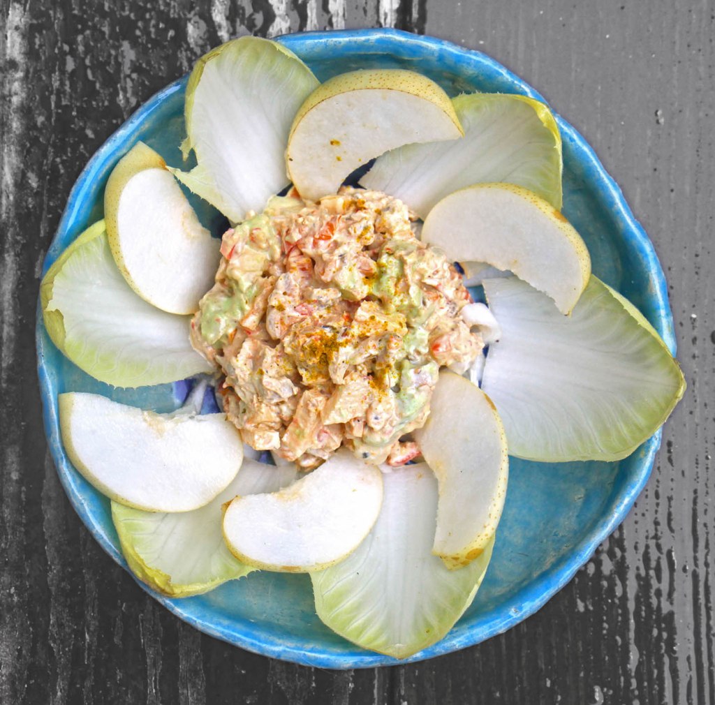 Für 2 Portionen: 200g mageres Geflügelfleisch – z. B. Gänsebrust, Truthahn-Brust … oder was sonst vom Festtags-Geflügel übrig geblieben ist – würfeln. 1 kleine Paprika (rot, gelb oder orange) häuten und von den Kernen befreien. 2–4 Frühlingszwiebeln in feine Rinde schneiden. 1/2 Birne und die Paprika klein würfeln und mit den Zwiebeln und dem Geflügelfleisch mischen. 2 EL fetten Joghurt (10 %), 1 EL Ketchup (oder BBQ-Soße) und 1 EL Mayonaise dazu geben, den Salat mit Curry (mild oder scharf ganz nach Geschmack), Salz und Pfeffer abschmecken. Mit Chicoree anrichten – die festen Blatt-Teile vom Chicoree in den Salat würfeln.