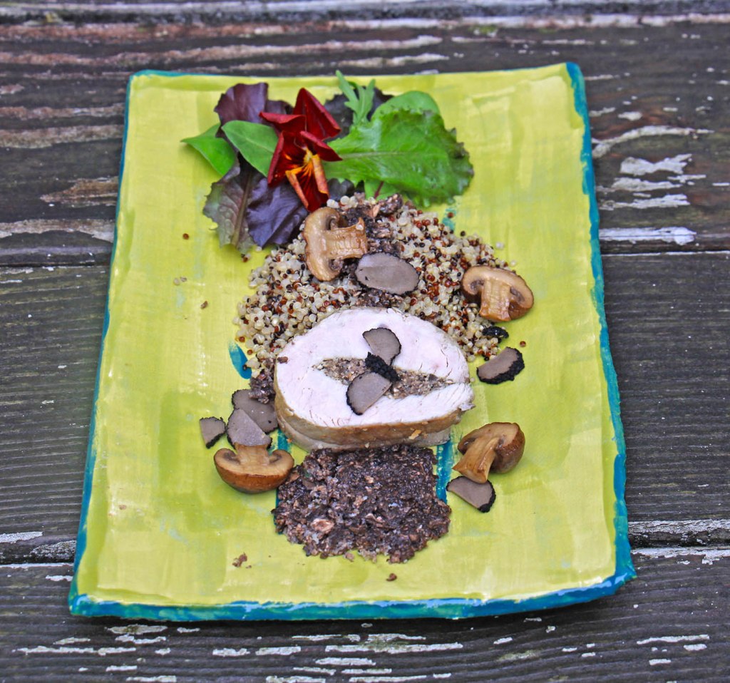 Für 4 Trüffelfans: 100g braune Champignons mit 2 EL Trüffelbutter und 20g Trüffel pürieren. Ein Putenfilet (ca. 600) mit einem Küchenkrepp trocken tupfen, eine Tasche hinein schneiden und auch von innen trocken tupfen. Mit 1/2 TL Trüffelsalz (z.B. Viani) von innen einreiben, dann das Pilz-Püree hinein drücken. Das Filet mit Küchengarn gut verschließen und dann auch von außen mit Trüffelsalz einreiben. Nun rundherum scharf anbraten und dann bei 80° im Backofen ca. 50 Minuten garen. In dieser Zeit bunten Quinoa nach Packungsanweisung zubereiten und mit 1 EL Trüffelbutter verfeinern. Einige braune Champignons halbieren und anbraten. Für die Soße: den Fleischsaft mit 50 ml Sahne und einem Schuss Sherry aufkochen und etwas reduzieren, dann mit 1 EL eiskalter Trüffelbutter aufschlagen und diese Soße zum Servieren über das Fleisch geben. Mit dem Quinoa und einem Wildkräutersalat anrichten.