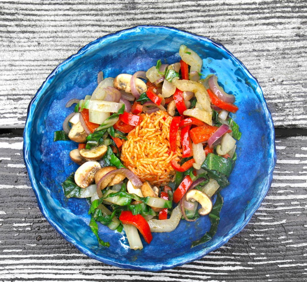 Für 2 Portionen: 3–4 große Mangold-Blätter schneiden (den Strunk in etwas feine Scheiben als die Blätter). 8 braune Champignons halbieren oder dritteln. 1 rote Spitzpaprika und 1 rote Zwiebel halbieren und in Streifen schneiden.1 Tasse Basmati-Reis mit 5 gehackten getrockneten Tomaten sowie 1 EL Tomatenmark mischen und mit einer Prise Salz und 1,5 Tassen Wasser mit geschlossenem Deckel aufkochen, Hitze herunter schalten und ca. 15 Minuten garen. In einem Wok 1 EL Erdnussöl erhitzen und das Gemüse anbraten, dabei mit der Zwiebel und den Scheiben vom Mangold-Strunk beginnen. Dann Paprika, Pilze und die Blätter zugeben. Mit Salz, 1 kleinen Chilischote (ohne Kerne) und 1 TL grünem Currypulver (z. B. Hara von Altes Gewürzamt) sowie 1 EL heller Soja-Soße würzen und sanft 5–10 Minuten weiter garen. Mit dem Reis anrichten.