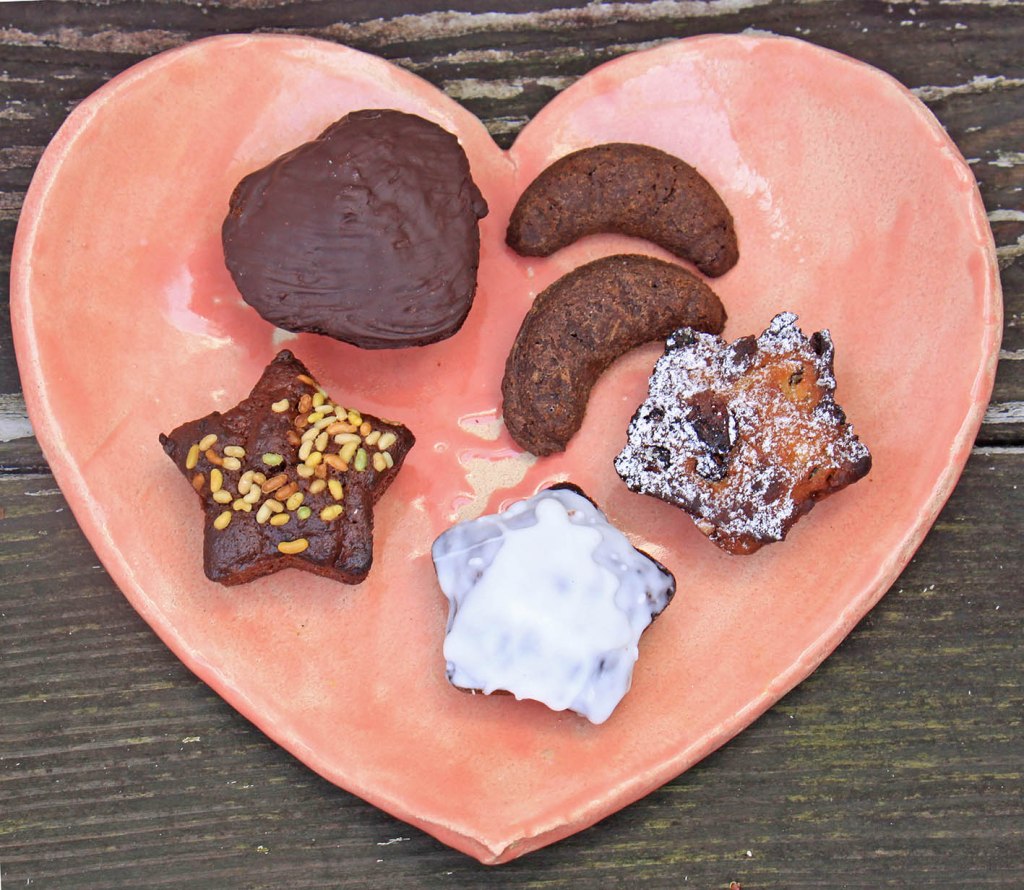 350g Trockenobst (Cranberries, Birnen, Ingwer) würfeln und in 100 ml rauchigem Whisky über Nacht einlegen. 3 Eier mit 100g Rohrzucker und 100g weicher Butter schaumig rühren. 100g Kastanienmehl, 1 Tl Backpulver dazugeben. Mit Kakao, Nelke, Kardamom und Zimt würzen. Je 50g Marzipan und Bitterschokolade gewürfelt sowie 100g gehackte Nüsse mit den eingelegten Früchte in einer Küchenmaschine fein hacken, dann mit dem Teig mischen und alles für 40 Minuten bei 160° in einer 24er Mini-Herzen-Backform (z.B. von Kaiser) backen. Nach dem Abkühlen mit 200g dunkler Schokolade überziehen. Mindestens 1 Tag durchziehen lassen.