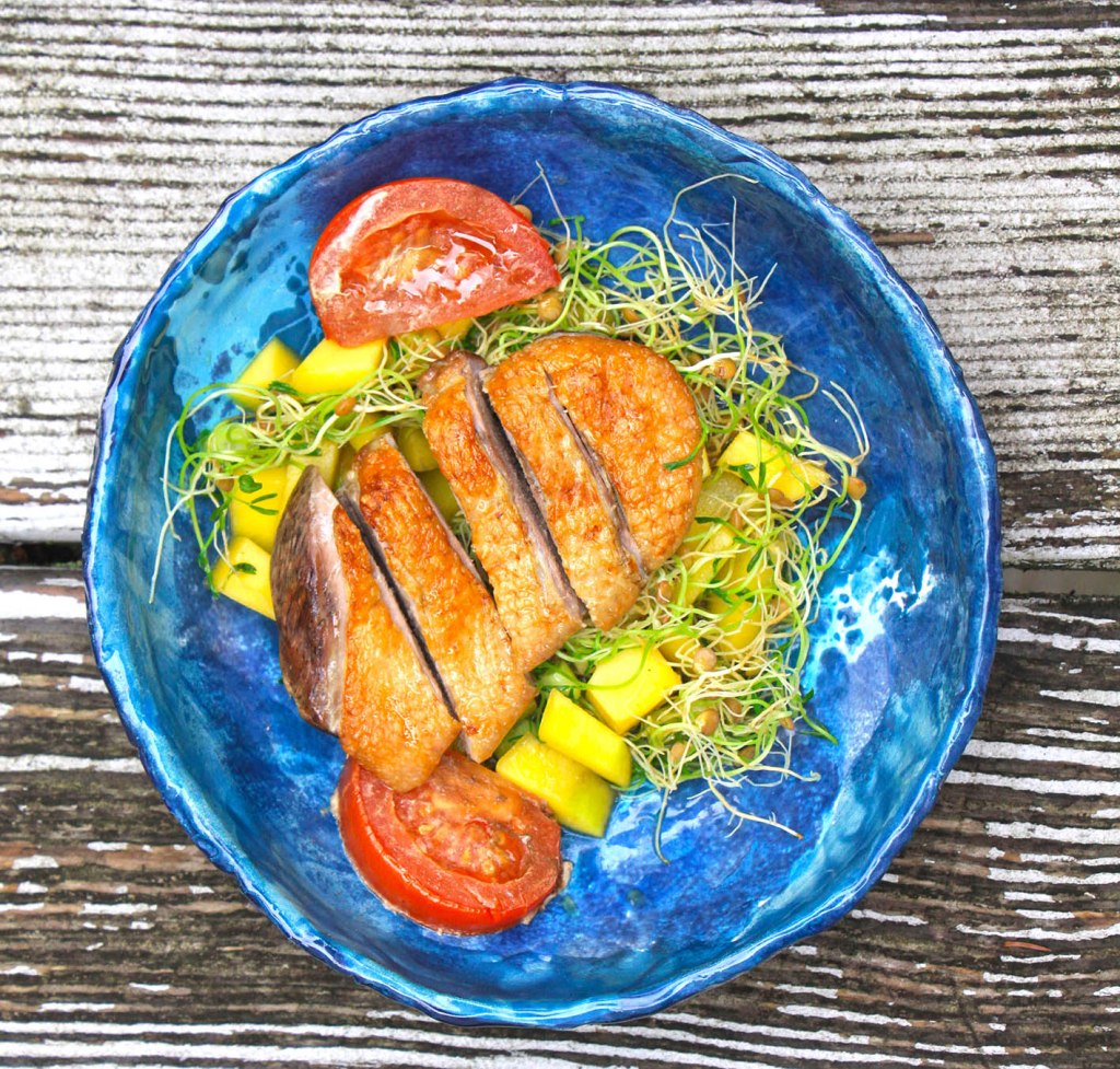Für 2: 1 Mango (nicht zu reif) in Würfel schneiden. 1 Sprossenglas Rote-Linsen-Microgreens waschen. 1 milde Zwiebel und 1 Bund Frühlingszwiebeln in Streifen schneiden. 1 Fleischtomate in dicke Scheiben schneiden. 2 kleine Entenbrüste auf der Fettseite einritzen. Die Tomatenscheiben in einen kleinen Bräter legen und die Entenbrüste mit der Fettseite nach oben im Backofen bei 80° ca. 40 Minuten garen. Dann den Backofen auf Grillfunktion schalten und die Haut ca. 10–15 Minuten schön knusprig werden lassen. Den Bräter aus dem Ofen holen. Fett und Bratsaft auffangen, die Tomaten nochmal teilen. In einem Wok nun Mango, Zwiebel und Sprossen kurz anbraten mit dem Bratsaft löschen, mit Salz und Ponzu-Sosse würzen. Die Entenbrüste in Scheiben schneiden und auf dem Gemüse anrichten.