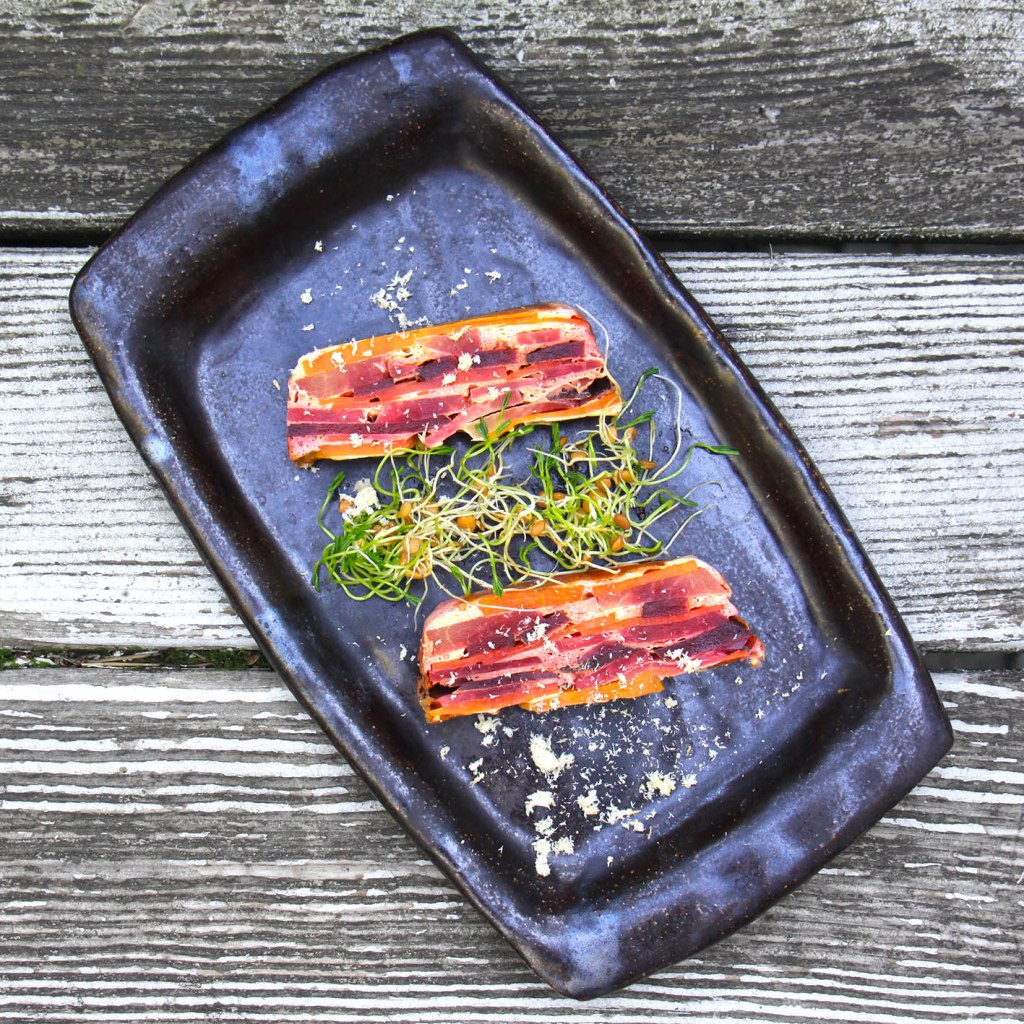 Für eine Kastenform (ca. 10×25 cm). Je 1 Süßkartoffel, Rote Bete und Kohlrabi in feine Scheiben schneiden (maximal 0,5 cm). 1 Ei, 100 ml Kochsahne und 100g Ziegenfeta mit einem Zauberstab pürieren. Den Ofen auf 160° vorheizen. Die Masse mit Salz, Pfeffer, Cumin, Paprika und Muskat würzen. Eine Kastenform mit (ofentauglicher) Frischhaltefolie (z.B. Bratschlauch) auslegen und genügend überstehen lassen um später alles abzudecken. Das Gemüse abwechselnd lagenweise in die Form schichten und zum Schluss mit der Ei-Käse-Masse übergießen und ca. 1 Stunde im heissen Ofen garen. Vollständig abkühlen lassen, in ca. 2 cm dicke Scheiben schneiden und mit Salat und frisch geriebenem Meerrettich vernaschen.