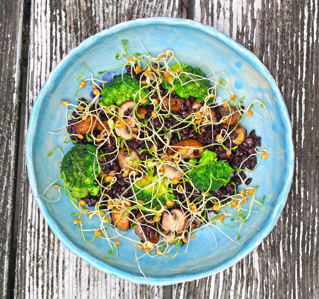 Für 2: Je 6–8 braune Champignons und Brokkoli-Röschen mit Knoblauch und Öl marinieren. 1 Tasse schwarzen Reis in reichlich Wasser (4 Tassen) ca. 30 Minuten kochen, evtl. Restwasser abgießen. 1 kleines Beet (7 x 10 cm) Linsensprossen ernten. In einer flachen Pfanne Öl erhitzen (z. B. Erdnussöl) und den Reis mit den Pilzen scharf anbraten. Den Brokkoli ebenfalls in die Pfanne geben; mischen und salzen. Die Sprossen erst zum Schluss untermischen. Wer es gerne scharf mag, schneidet eine kleine rote Chili dazu.