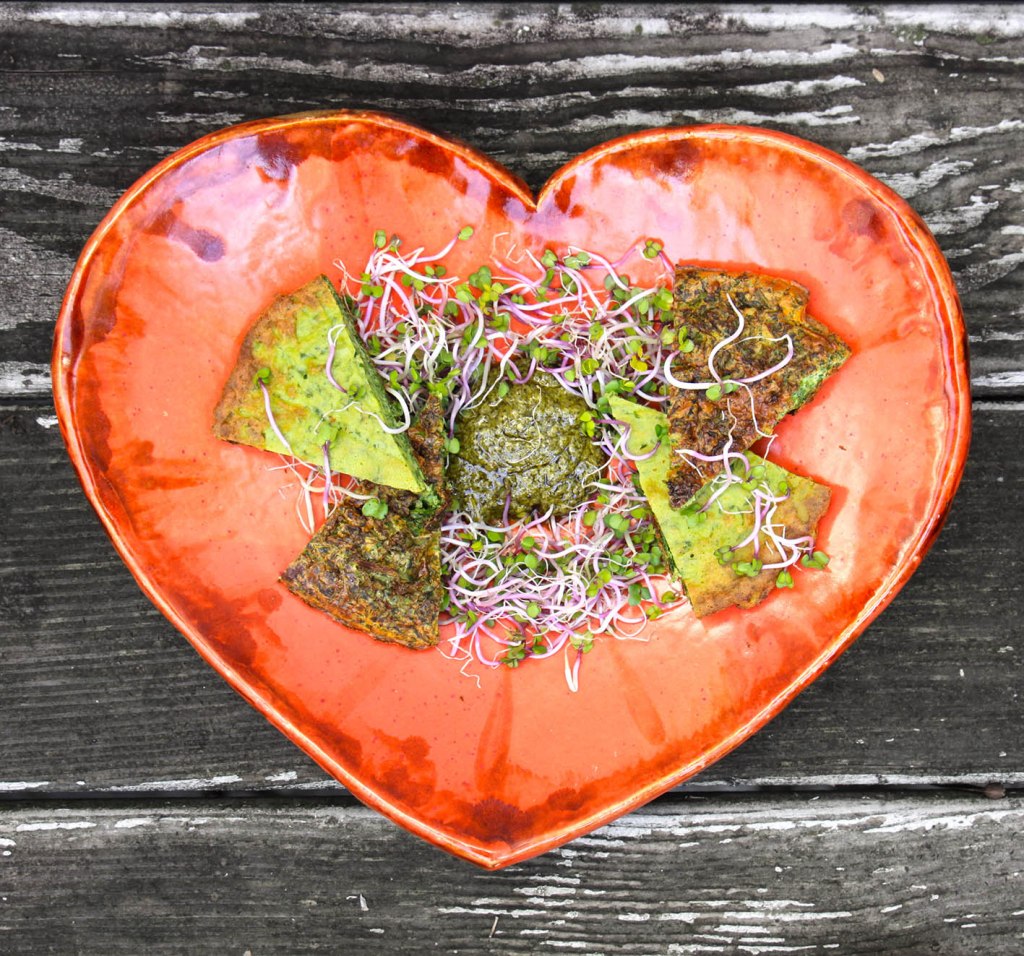 Für 2 als leichtes Lunch: 150g zarte Grünkohlblätter (ohne Strunk) hacken und in einer Küchenmaschine oder mit dem Zauberstab mit 2 Eiern, je 2 EL Maniokmehl und Milch sowie 1/2 TL Salz und 1 TL grünem Currypulver (z.B. „grüner Kakadu“/Herbaria) oder Hara/Altes Gewürzamt) gründlich mixen. Oder selbst eine Mischung zubereiten aus: Paprika, Kreuzkümmel, Korianderblättern, Ingwer, Knoblauch, Pfeffer, Zitronengras, Fenchel, Sternanis, Nelken, Kardamom und Orangenschale. Bei der Zubereitung einer Gewürzmischung immer die Samen (z.B. Fenchel) vorher in einer kleinen Pfanne ohne Fett leicht rösten. Dann mörsern und mit den gemahlenen Gewürzen und den feuchten Zutaten (z. B. Ingwer) mischen. Die Grünkohl-Masse in eine kleine Backform (ø 20 cm) geben und (auf Backpapier) im Backofen bei 180° ca. 30 Minuten backen, bis die Oberfläche leicht gebräunt ist. 1 Sprossenglas Rote Rettich-Sprossen (China Rose) ernten und mit der Frittata vernaschen. Dazu passt Grünkohl-Pesto (siehe Rezept vom Dienstag).