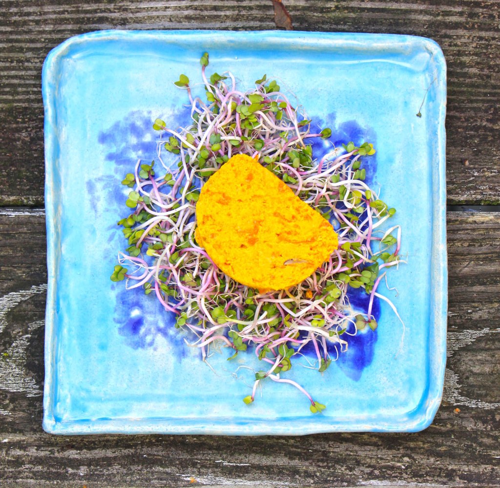 Für eine längliche Pastetenform (ca. 5×25 cm): 1 Hokkaido (später brauchen wir ca. 500g) halbieren, die Kerne entfernen und im Backofen bei 160° ca. 25 Minuten garen. 100g Kumquats mit kochendem Wasser überbrühen, etwas abkühlen lassen und die Kerne entfernen. Den gegarten Kürbis, die Kumquats, 3 Eier, 20g Sesamsamen, je 1 Prise Safran, Salz und Pfeffer sowie 2 TL Kürbisgewürz pürieren (z. B. Kürbiskönig von Herbaria – oder Cumin, Curry und Kurkuma). Die Pastetenform mit etwas Sesamöl einfetten, die Kürbismasse einfüllen und im Wasserbad 40 Minuten bei 180° garen (einen passenden flachen Bräter oder ein tiefes Blech ca. 2 cm mit Wasser füllen und die Pastetenform hineinstellen). Auf jeden Fall noch ca. 15–20 Minuten abkühlen lassen. Lauwarm oder kalt mit Sprossen und Salat vernaschen.