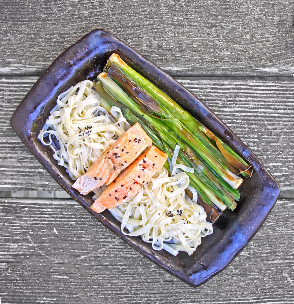 Pro Portion: 2–3 junge Lauchstangen (wenn man nur großen Lauch hat, 1 Stange halbieren) mit einer Mischung aus Olivenöl und Zitrone (zu gleichen Teilen) und etwas Meersalz bestreichen und im Ofen oder auf dem Grill 10–15 Minuten rösten. In dieser Zeit 150g Saiblingsfilet ca. 5 Minuten auf der Haut braten und 80g Reis-Bandnudeln kochen, abgießen und mit je 1 EL Sesamöl und Ponzu-Soße (oder Soja-Soße und 1 TL Zitronensaft) mischen. Entweder, wie auf dem Bild, alles getrennt anrichten und mit schwarzem Sesam bestreuen. Oder den Lauch in ca. 2 cm lange Stücke und den Fisch ebenfalls in große Würfel schneiden, und beides mit den Nudeln vorsichtig in der Pfanne mischen.