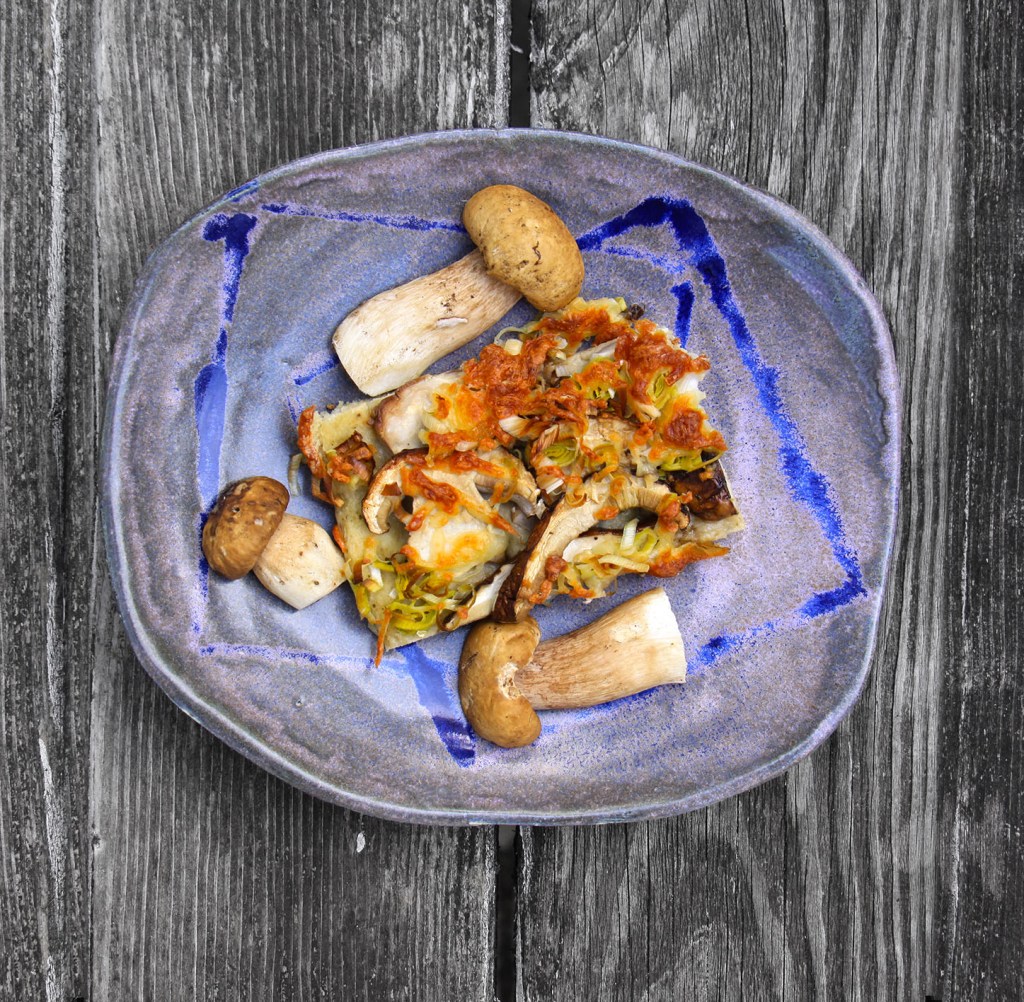 1 Würfel Hefe mit 1/2 TL Zucker und 100ml lauwarmem Wasser glatt rühren. 400 g Pizzamehl, 3 EL Öl, 1 Tl Salz und 1 TL gehackten Estragon hinzugeben und alles zu einem glatten Teig kneten. Diesen abgedeckt an einem warmen Ort (z. B. unter einer Decke) ca. 2 Stunde gehen lassen. Den Ofen auf 220° mit Unterhitze vorheizen. Ein tiefes Blech oder eine große Backform (ca. 25×32) mit Backpapier auslegen und den Teig mit den Händen in die Größe der Form ziehen. 3 El Kräuterfrischkäse auf dem Teig verstreichen. 2–3 Frühlingszwiebeln fein hacken und auf den Frischkäse geben. 400g Steinpilze in dicke Scheiben schneiden und verteilen. Mit Meersalz und gehacktem Estragon würzen. Mit 200g Burrata oder Mozarella belegen und ca. 20 Minuten backen.