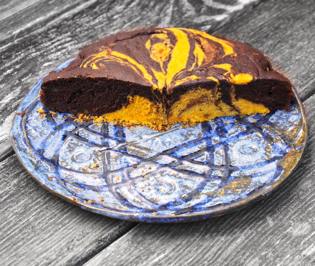 ca. 300g Kürbis-Püree (Butternut, Hokkaido) herstellen. Dafür ca. 1 kleinen Hokkaido oder Butternut rundherum mit einer Gabel mehrmals einstechen und mit Schale im Backofen bei 180° ca. 30 Minuten garen. Je nach Kürbisart schälen und Kerne entfernen und dann pürieren. 180g Butter sanft schmelzen. 180g braunen Zucker und 4 Eier (M–L) schaumig rühren. 300g Dinkelmehl, 2 EL Grieß, 20g Backpulver, 1 TL Tonkabohne sowie die geschmolzene Butter und das Kürbispüree dazu geben und auf mittlerer Stufe weiter rühren. Mit 1 Prise Salz würzen. Eine Springform (ø 28 cm) einfetten oder mit Backpapier auslegen und ca. 1/3 des Teiges einfüllen. 3 EL Kakaopulver und einen Schuss Rum zum restlichen Teig geben und gut verrühren. Den dunklen Teig auf den Hellen geben und mit einem Teigschaber marmorieren. Bei 160° ca. 40 Minuten backen.