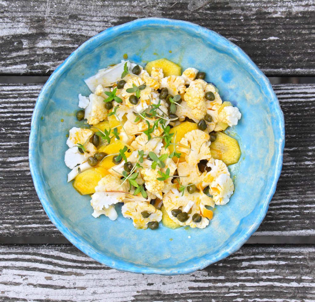 Für 2 die Rohkost lieben: 1 gelbe Bete nach dem Schälen sehr fein hobeln und in kaltes Wasser legen. 4 dicke Blumenkohl-Röschen (ca. 1/4 eines normalgroßen Kohls) in feine Scheiben schneiden. 1 Weinbergpfirsich (noch fest) ebenfalls in Scheiben schneiden und mit dem Blumenkohl in einer Schüssel mischen. 2 EL kleine Kapern dazugeben. In einem Schraubglas 1 EL Honig, 1/2 TL Salz, 1 EL Leinöl mit Sanddorn, 2 EL Orangen Balsam-Essig (beides z. B. Ölmühle Solling) gut mischen. 4 EL Hanfsprossen ernten (alternativ Kerbel oder Kresse nehmen). Die Bete abtropfen und zum Blumenkohl geben. Alles vorsichtig mit dem Dressing mischen und mit den frischen Sprossen anrichten.