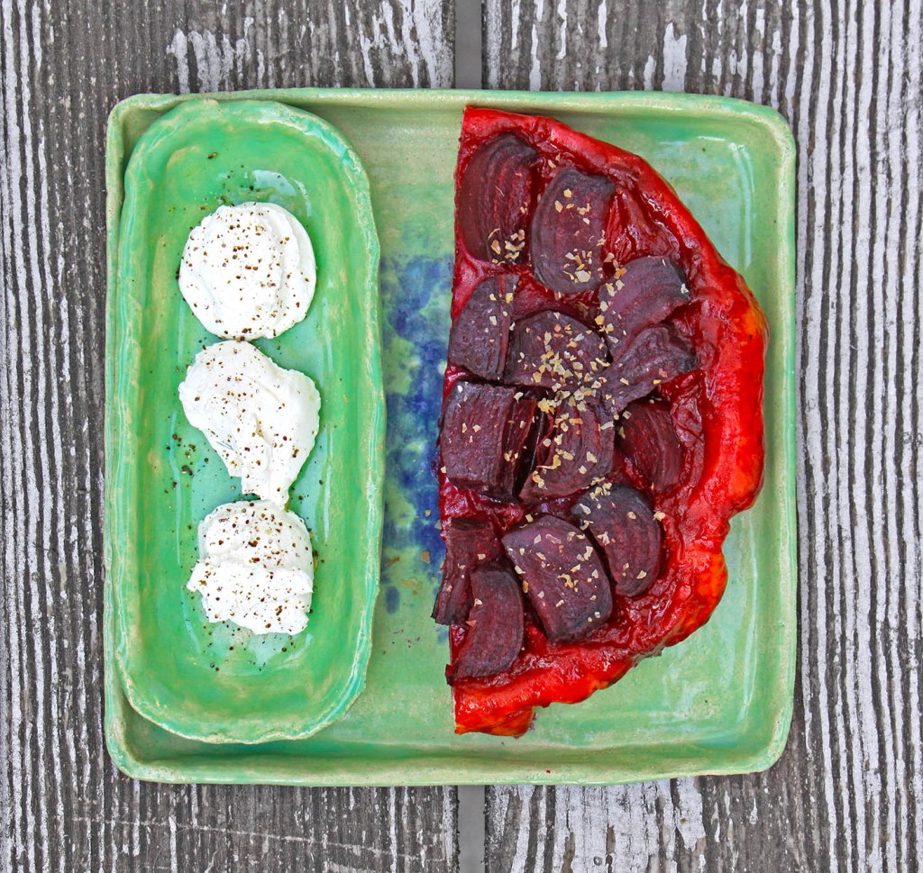 Für eine kleine Tarte-Tatin-Form oder eine ofentaugliche Pfanne ø 20 cm: 4 kleine (ø ca. 4 cm) Rote Bete In in Spalten schneiden. Den Backofen auf 170° vorheizen. In der Tarteform auf der Herdplatte 2 EL Zucker langsam schmelzen und dann ca. 40g leicht warme Butter dazugeben – von der Hitze nehmen und gut verrühren. Die Bete-Spalten von aussen nach innen in die Form legen und mit etwas Fleur de Sel bestreuen. Ein Blätterteig-Quadrat von ca. 25×25 cm leicht faltig auf die Spalten drücken und im heißen Ofen ca. 30 Minuten backen. Nach dem Backen ca. 10 Minuten abkühlen lassen und auf einen Teller stürzen. Lauwarm mit Ziegenrahm (sahniger Frischkäse) vernaschen.
