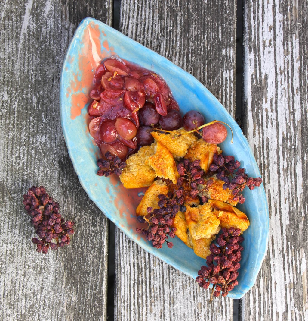 für 2 Naschkatzen: Für das Traubenkompott 250g blaube Trauben halbieren und die Kerne, soweit möglich, entfernen. In einen Topf geben und mit 100 ml Traubensaft (oder Wein) und 2 EL Tresterbrand aufkochen und mit geschlossenem Deckel ca. 10 Minuten sanft köcheln. 1 TL Agartine untermischen nochmals ca. 2 Minuten köcheln – diesmal ohne Deckel. Das Kompott etwas abkühlen lassen. Für den Schmarren: 3 Eigelb, 50g Butter und 70g Zucker schaumig rühren mit je 3 EL Grieß und Tresterbrand sowie 200g Magerquark und 1 Päckchen Vanillezucker vermengen. 3 Eiweiß mit einer Prise Salz steifen schlagen und unterheben. In eine eingefettete Auflaufform füllen und bei 180° ca. 25 Minuten backen. Mit zwei Gabeln zerreißen und mit Kompott servieren.