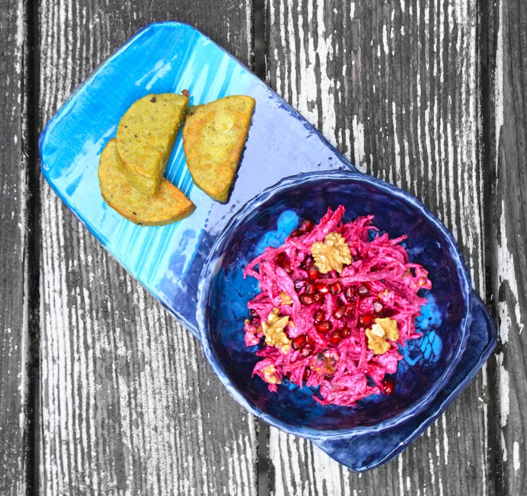 Für 2 Bete-Fans: 1 große Bete fein in Streifen hobeln (Julienne). 1 EL Sushi-Ingwer in feine Streifen schneiden und mit der Bete mischen. 50ml Sahne mit 1 TL Wasabipaste steif schlagen. 50g Walnüsse hacken und 1/2 Granatapfel entkernen. Alles mischen und mit Salz und Wasabi (je nach gewünschter Schärfe) abschmecken.