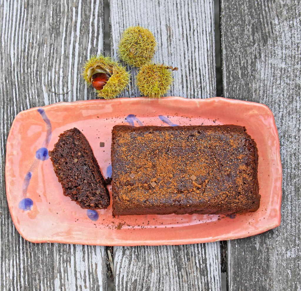 Backofen auf 180° Ober- und Unterhitze vorheizen. Eine längliche Kastenform ca. 24 cm mit Backpapier auslegen. 4 Eier trennen. Eiweiß mit einer Prise Salz steif schlagen. 150g weiche Butter mit 90g Zucker und 50g Kokosblütenzucker cremig rühren. Eigelb dazugeben und gut unterrühren. 250g Maronenpüree (aus vorgegarten Maronen) dazugeben und unterrühren. 80g gemahlene Mandeln, 2 EL Kakao und 2 TL Backpulver mischen und im Wechsel mit dem Eischnee unterheben. In die Form geben und im vorgeheizten Ofen auf der mittleren Schiene ca. 50 – 60 Minuten backen. Kuchen ca. 20 Minuten in der Form abkühlen lassen. Herausnehmen und auskühlen lassen.