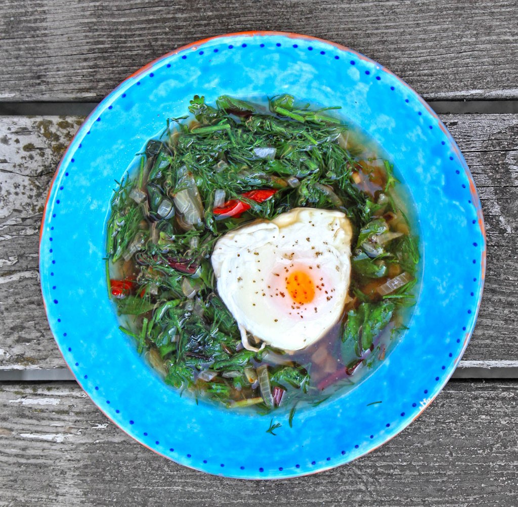 Für 2 Kräuterfans: 200g gemischte Kräuter – Dill, Schnittlauch, Basilikum, Koriander, Kerbel, Sauerampfer und Spitzwegerich (oder z. B. aus einem Paket „Grüner Soße“) – nicht zu klein hacken. 1 Zwiebel und 2 Knoblauchzehen fein würfeln und in einem Topf in etwas Olivenöl bräunen, 2/3 der Kräuter und nach evtl. eine kleine gehackte Chili (ohne Kerne) darauf geben und mit 400 ml kochendem Wasser aufgießen. Mit Salz und Pfeffer abschmecken. Den Topf vom Herd nehmen. 2 Eier in siedendem Essigwasser pochieren. Die Suppe in 2 Teller geben die restlichen frischen Kräuter darauf verteilen und jeweils ein pochiertes Ei hineinlegen.