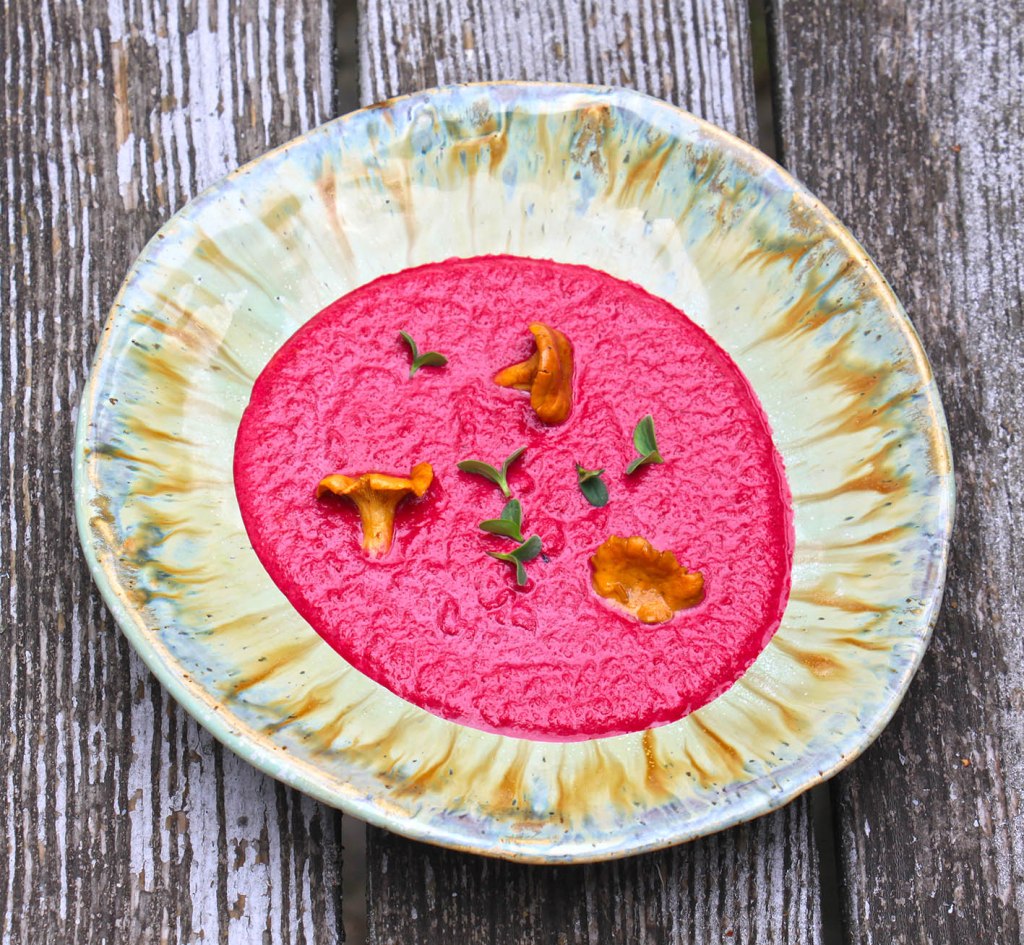 Für 2 Suppenkasper: 1/2 Radicchio teilen, 2 Rote Bete und 2 Kartoffeln würfeln und mit 1 TL Salz sowie 3 EL Olivenöl 15 Minuten bei 160° mit Oberhitze im Backofen garen. Dann in einem leistungsstarken Mixer zusammen mit 150ml Gemüsebrühe gründlich pürieren. 200g Pfifferlinge putzen und in etwas Olivenöl anbraten. In die Suppe geben, mit etwas gehacktem Schnittlauch bestreuen und nach Belieben heiß oder lauwarm servieren.