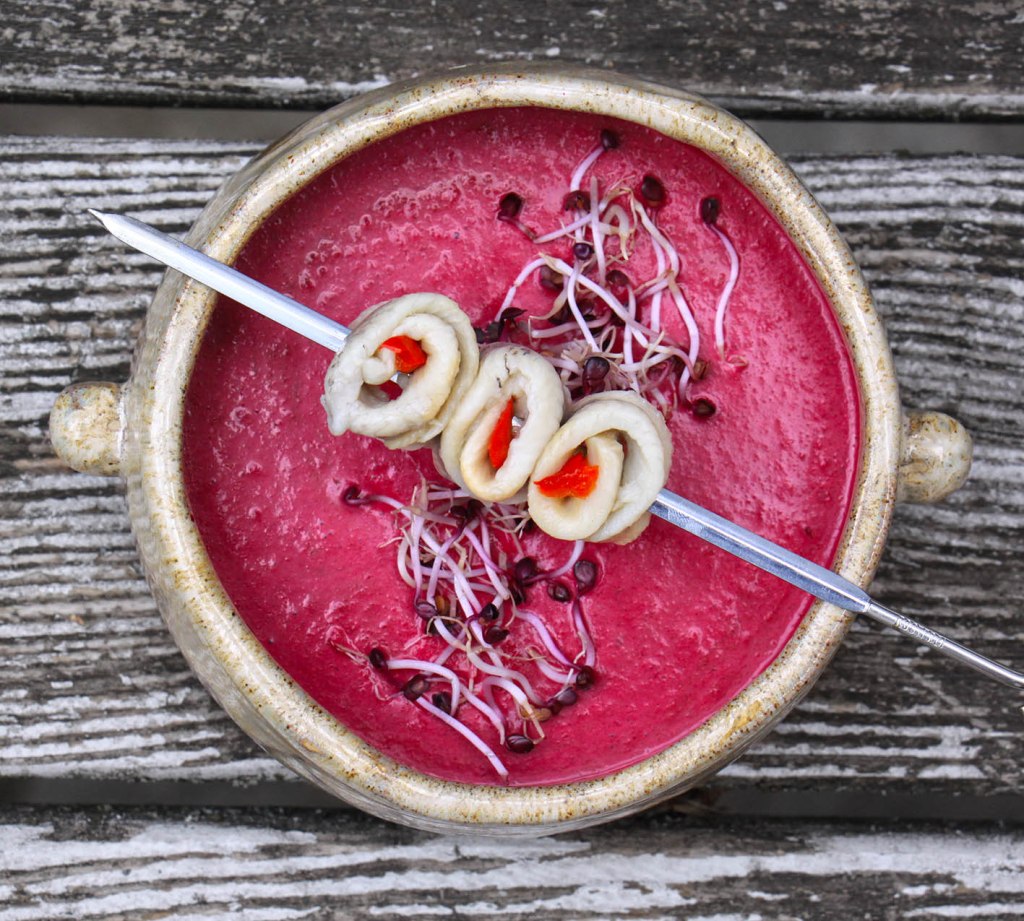 Für 2 Rohkost-Fans: 1/2 Radicchio und 2 Rote Bete würfeln und mit dem Saft 1 Zitrone, 1 TL Salz sowie 3 EL Olivenöl ca. 1 Stunde marinieren. Dann zusammen mit 100ml Granatapfelsaft in einem leistungsstarken Mixer gründlich pürieren. Durch ein grobes Sieb passieren und mit 150g Joghurt (3,5%) mischen. 6 kleine marinierte Herings-Filets (wenn man größere hat, 3 halbieren) bereit legen. 1/4 Zwiebel, 1 kleine Essiggurke und 1/4 rote Paprika in feine Streifen schneiden, auf die Fischfilets legen und aufrollen. Mit einem Spieß auf der Suppe anrichten. Rote Radieschen Sprossen passen Geschmacklich auch sehr gut dazu.