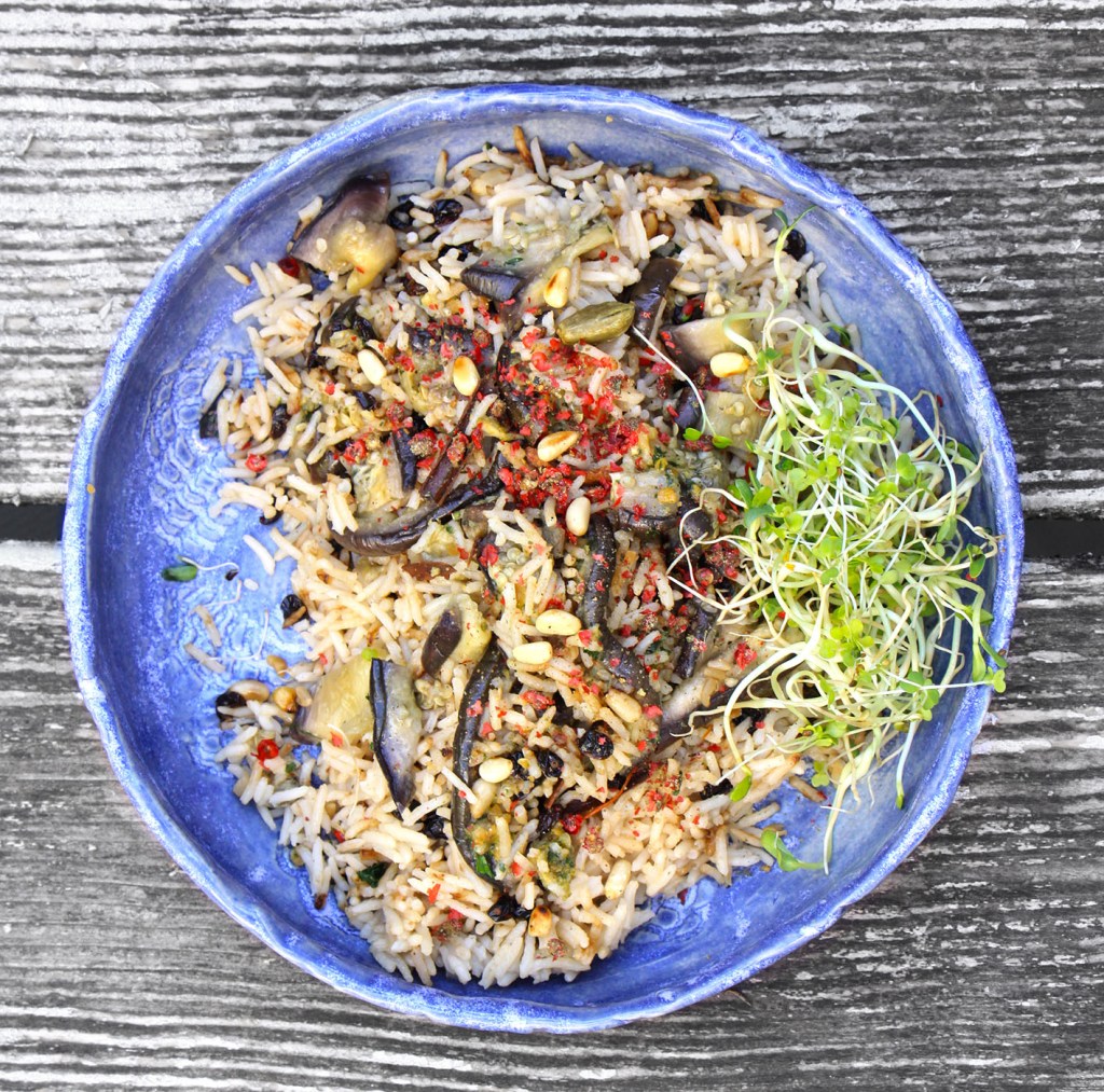 Für 2–4: In einem großen Topf 2 EL Ghee erhitzen – 2 Kapseln Kardamom, 3 cm Zimtstange, 1 El rosa Pfefferbeeren anbraten, 2 Auberginen, 2 Zwiebeln (gewürfelt) und 200g Basmatireis mitbraten. Mit 1/2l Gemüsebrühe aufgießen – einmal aufkochen. 50g Korinthen und 50g gehackte Nüsse (Pistazien, Pinienkerne, Cashews oder Mandeln) unterrühren und alles bei geschlossenem Deckel ca. 30 Minuten auf kleinster Hitze (Elektro auch gerne ausschalten) garen, mit Salz, Cayennepfeffer und Granatapfelpulver abschmecken und nach Belieben mit frischen Kräutern (Minze, Koriander) oder Sprossen toppen. Zimtstange und Kardamomkapseln herausfischen.