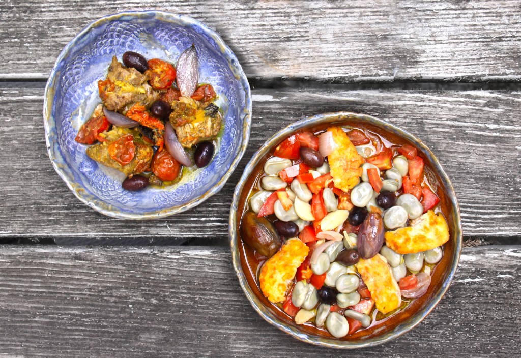 VEGGIE: Wenn der Eintopf vegetarisch mit dicken weißen Bohnen zubereitet wird, diese (ca. 750g) in reichlich Olivenöl anbraten und mit Oliven und Tomatenstücken ca. 20 Minuten schmoren. Dann wie oben beschrieben die karamelisierten Zwiebeln zugeben. Und z.B. mit gegrillten Haloumi servieren.