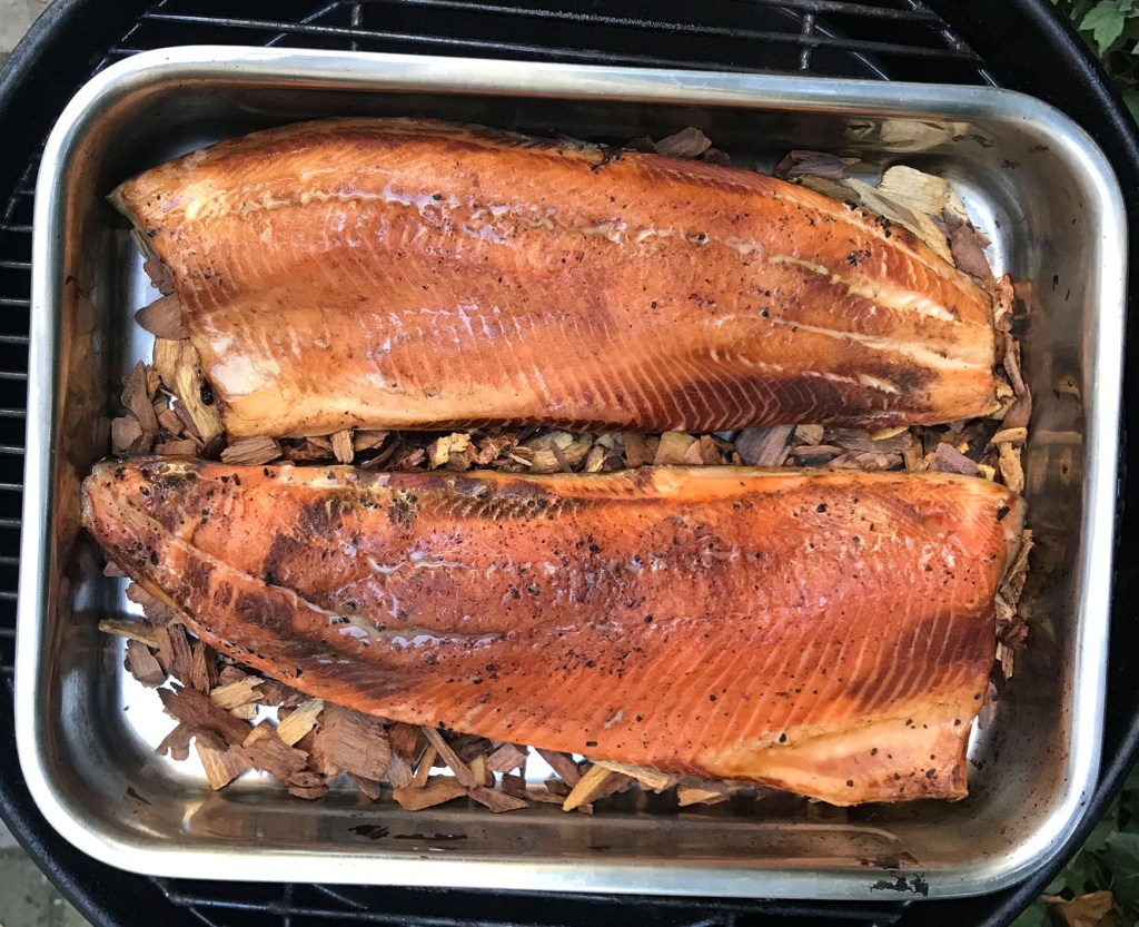 2 EL Kaffeebohnen grob mörsern. 4 EL Wiskey, 1 TL geräuchertes Meersalz und 1 EL Orangensaft mit den gemörserten Bohnen mischen und 2 Seiten vom Saibling (mit Haut) mit der Mischung einreiben. In einer flachen Glasschüssel mit Deckel (so luftdicht wie möglich) mindestens 8 Stunden beizen. Brettchen oder Räucherholzstückchen wässern, den Grill auf niedrigste Temperatur vorheizen. Von den Fischhälften die Beize etwas abtupfen und mit der Hautseite auf das Holz legen und sanft ca. 40 Minuten garen. Schmeckt lauwarm oder kalt mit Sahnemeerrettich und Gurkensalat …