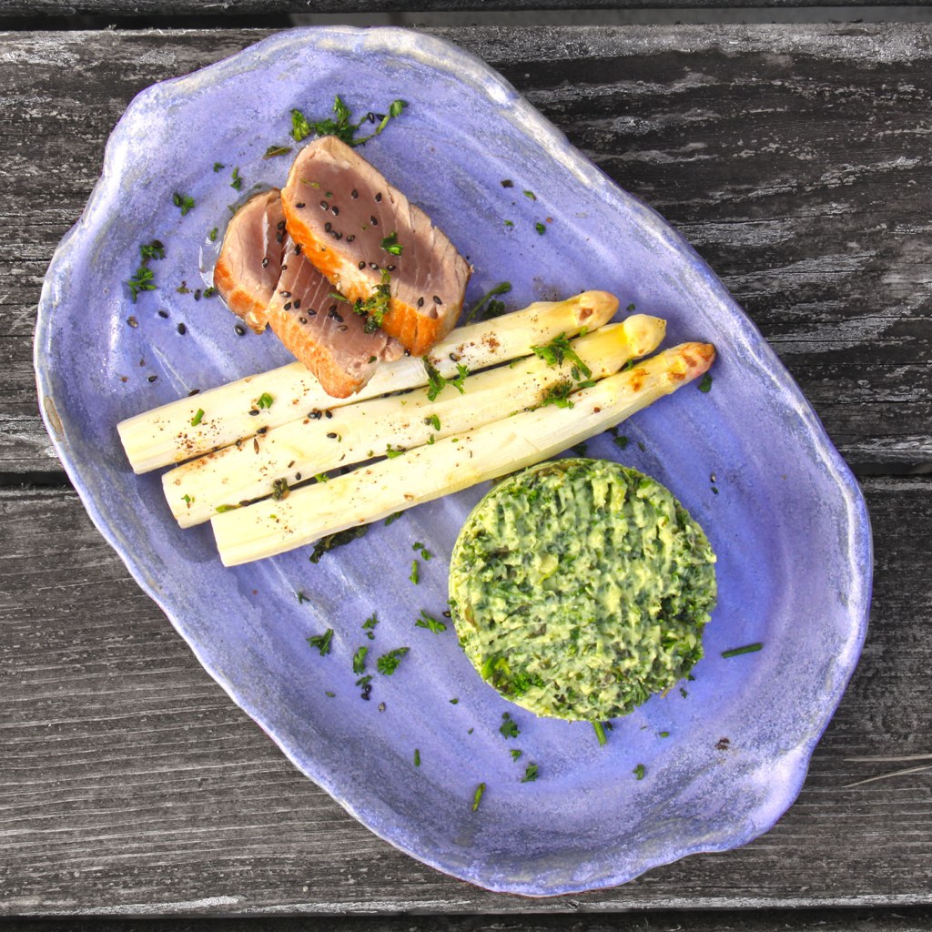 1 Päckchen grüne Soße Kräuter (ca. 200g – 7 Kräuter der Saison – Petersilie, Schnittlauch, Sauerampfer, Pimpinelle, Borretsch, Kerbel, Kresse) fein hacken. 500g Kartoffeln (mehlig kochende) im Backofen bei 180! ca. 30 Minuten garen. Schälen. 25g Butter (oder 3 EL Olivenöl) dazugeben und stampfen – dann die gehackten Kräuter unterrühren. Mit Salz, Pfeffer, Muskat abschmecken. Als Beilage zu gebratenen Austernpilzen, Schnitzel oder gegrilltem Fisch.