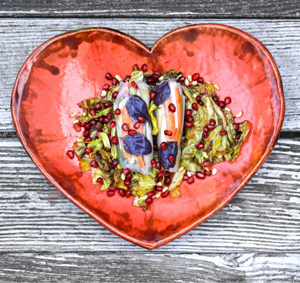 1 Wirsing in breiten Streifen anbraten und mit Teriyaki-Soße und etwas Sake ablöschen; ca. 15 Min. köcheln lassen. Pinienkerne rösten. 1 Granatapfel entkernen. 18 Blätter Reispapier anfeuchten. 100g Berglinsen und 2 klein gewürfelte Kartoffeln kochen; 1 Zwiebel, 1cm Ingwer, 1 Knoblauchzehe, 2 Frühlingszwiebeln und 6 Champignons fein würfeln, und alles zusammen anbraten, mit Linsen und Kartoffeln mischen und 10 der Teigblätter damit füllen und zu festen Rollen wickeln. Für die restlichen Rollen 300g Hähnchenfilet, 300g Garnelen und 3 Frühlingszwiebeln, anbraten und mit Zitronengras, Knoblauch und Ingwer würzen; 8 Teigblätter damit füllen und fest aufrollen. Die gefüllten Rollen auf den Wirsing legen und noch etwas dämpfen. Herausnehmen und die Bowls anrichten. Wirsing mit den Granatapfel- und den Pinienkernen bestreuen und jeweils 3 Rollen darauflegen.