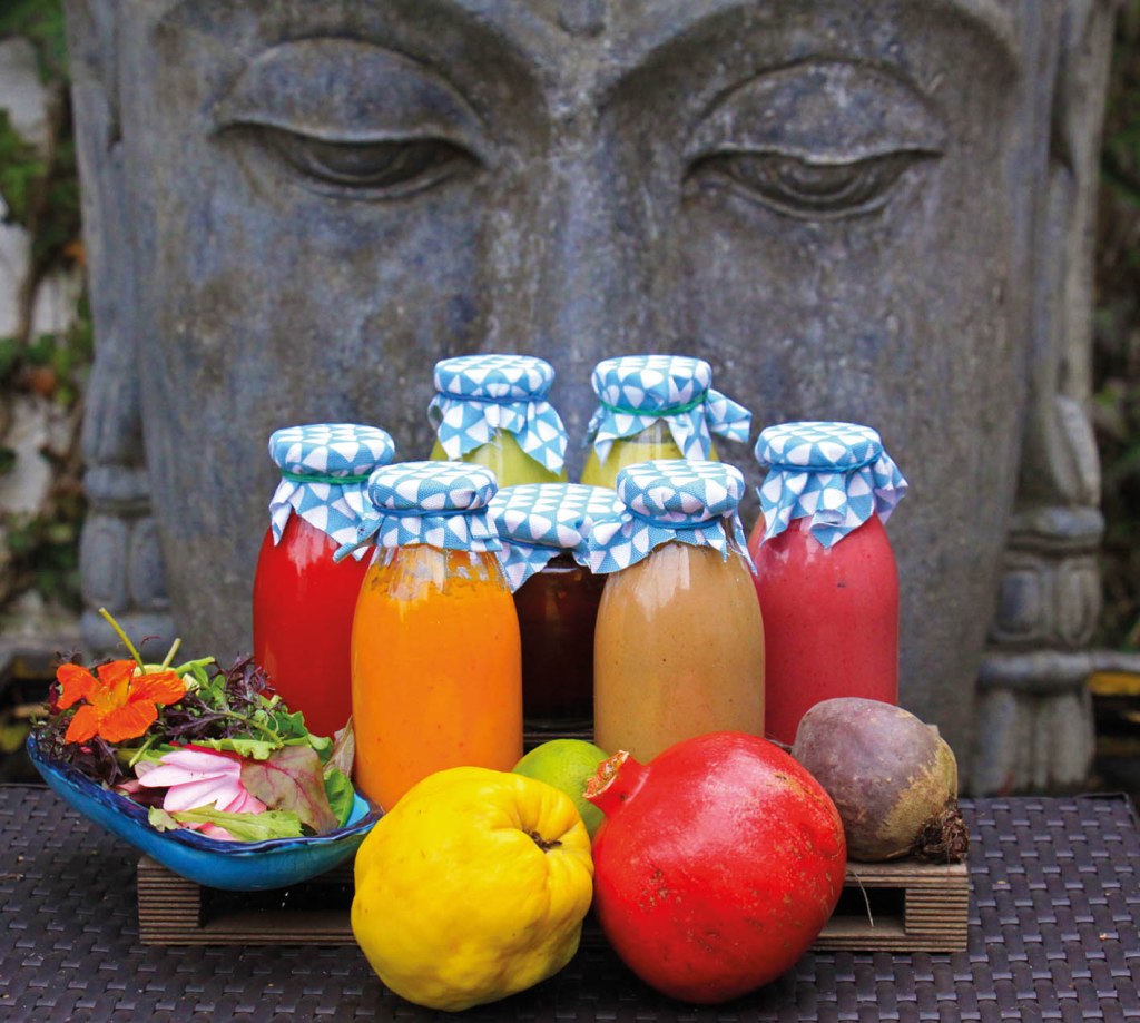 QUITTE & MINZE (scharf, herb): 50 ml Quittensaft (alternativ Sanddorn) mit 1 kleinen gekochten Kartoffel, 10 Blatt Minze und 2 EL Hanföl pürieren.