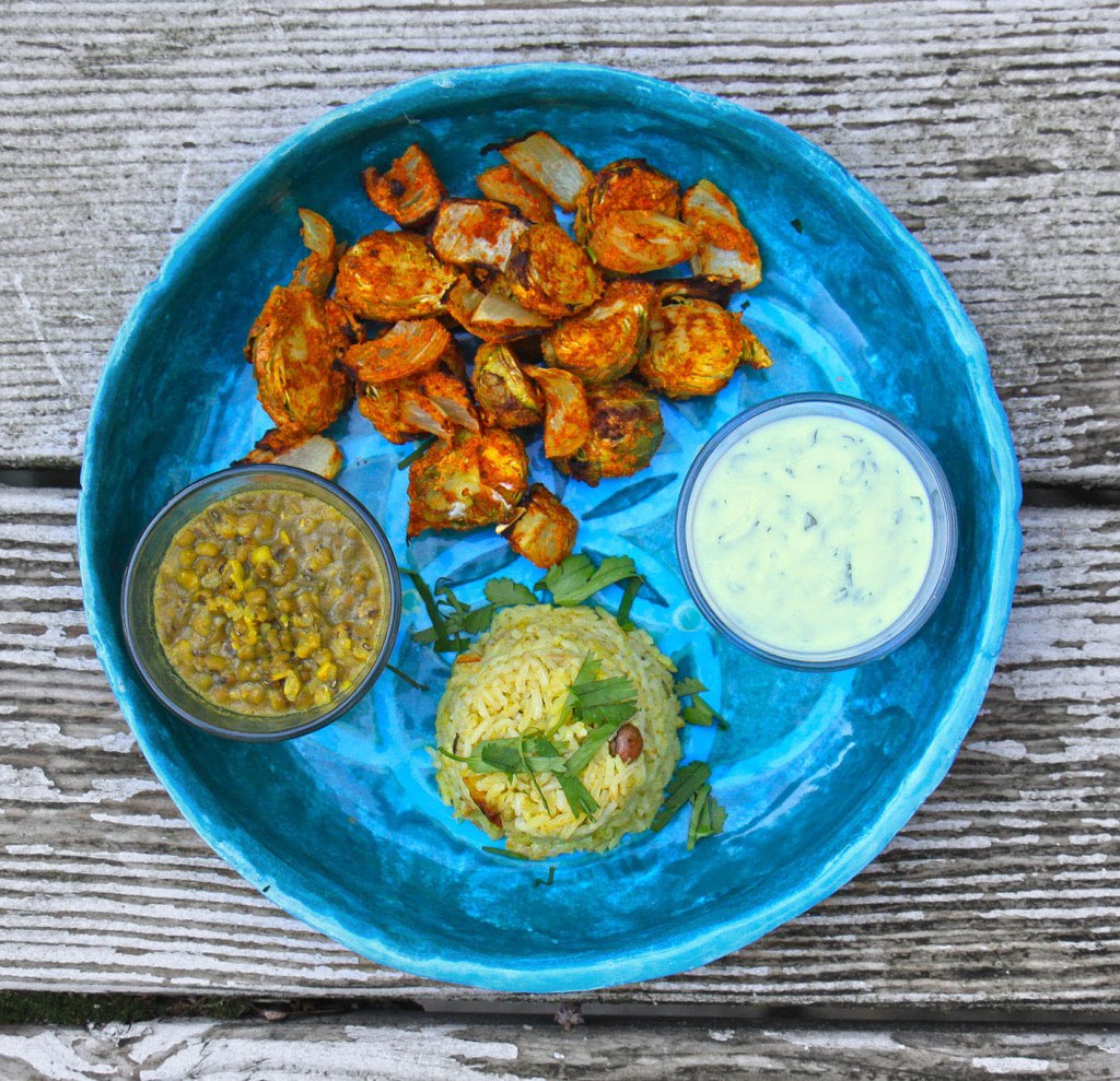 1 Kg Rosenkohl waschen und halbieren oder dritteln; 200g Joghurt* mit dem Saft 1 Limette und 2 EL Tandoori-Gewürz verrühren und mit dem Gemüse mischen; über Nacht oder mind. 3 Stunden marinieren. 1 große Zwiebel in Stücken dazugeben. Den Backofen und ein Backblech auf 220° vorheizen und das Gemüse auf das heiße Blech geben. Nach ca. 15 Minuten ist das Tandoori fertig. Mit Dal, Raita (Joghurt-Minz-Soße) und Chapati (oder Reis) servieren. Diese Zubereitung eignet sich auch sehr gut für Blumenkohl – diesen dafür vor dem Marinieren in Röschen teilen.*Ihr könnt das Gericht auch mit veganer Küchencreme zubereiten.