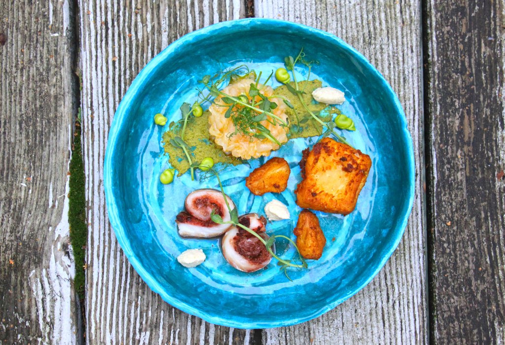 Tatar mit Erbsensprossen: 300g Skrei in 3%iger Salzlake mindestens 1 Stunde im Kühlschrank ziehen lassen. 100TK Erbsen mit je 1EL Minze, Öl, Zitrone und 1 Prise Salz fein pürieren. Das Erbsenpüree bis zum Anrichten kalt stellen. Den Skrei trocken tupfen und wenn möglich auf ein Eiswürfelbett legen, bis er sehr gut durchgekühlt ist. Kurz vor dem Anrichten das Fischfilet durch die mittlere Scheibe des Fleischwolfes drehen (oder fein schneiden) und mit etwas Öl, Salz, Zitronensaft und -abrieb (ich habe ein „Leinöl mit Sanddorn“ von der Ölmühle Solling genommen – sehr lecker) und fein geschnittene Schalotten Würfeln abschmecken. Zum Anrichten einen breiten Streifen Püree auf den Teller streichen, das Tatar in einem kleinen Ring darauf platzieren und Erbsensprossen darüber geben.