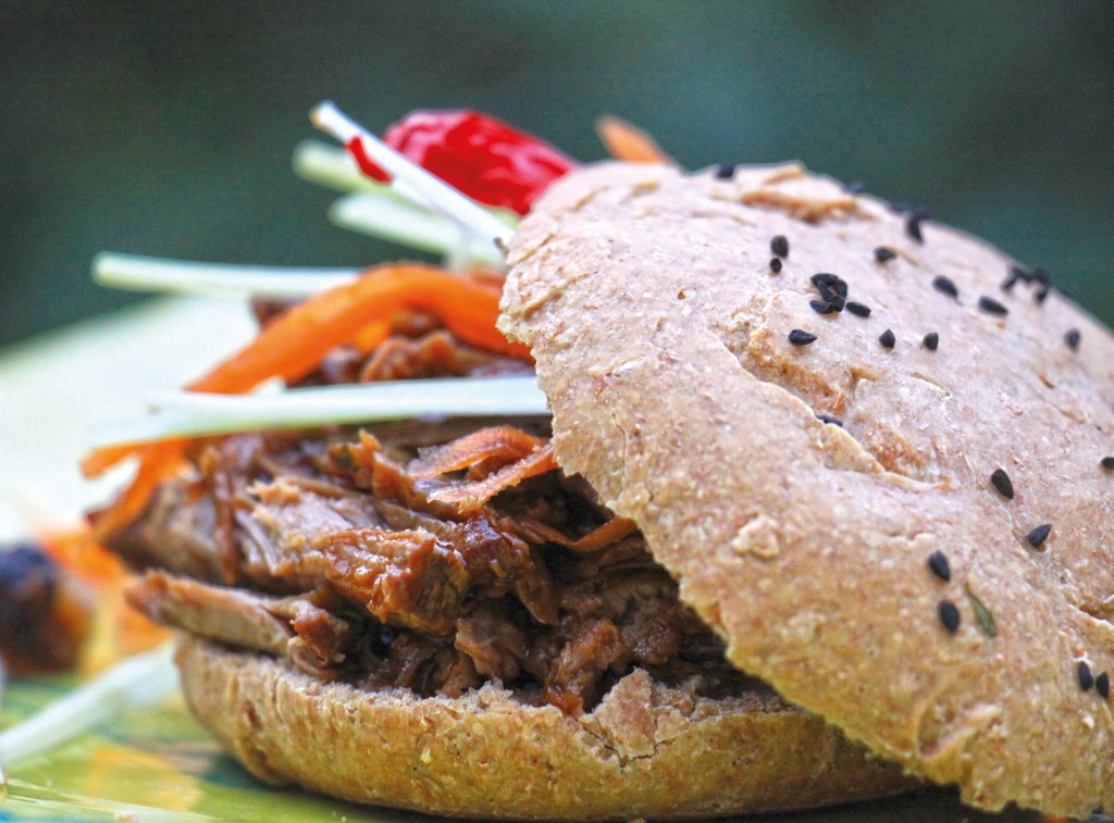 3 Entenbrüste (ca. 800g) von Sehnen befreien und mit einem Rub aus 2 TL Rohrzucker, 1/2 TL Meersalz und je 1 gestr. TL gemahlenem Koriander, Zitronenpfeffer, Mangopulver, Anis sowie je 1/2 TL Zimt, Nelken und Orangenschale einreiben. Gut verschlossen 3–4 Stunden marinieren. Backofen auf 160° vorheizen. Fleisch mit der Haut nach unten in einen kalten ofenfesten Bräter legen und 10 Minuten langsam erhitzen – dann das Fett abschütten. Jetzt Hitze hochdrehen und die Ente auf beiden Seiten kurz anbraten. Ente aus dem Bräter nehmen, Haut ablösen und später getrennt kross braten. Herd ausschalten und 2cm Ingwer, 1 Chili und 2 Knoblauchzehen (fein gehackt) kurz anschwitzen mit 5 EL Reis-Essig ablöschen, dann je 3 EL Teriyaki- und Sojasauce, und 150ml Geflügelbrühe angießen. Jetzt die Ente wieder in den Bräter legen und diesen (mit Deckel) in den Ofen geben und ca. 2 Stunden schmoren. Nach 20 Minuten die Hitze auf 120° runterdrehen. Das Fleisch aus der Soße nehmen und mit einer Gabel zupfen. Die Soße etwas reduzieren. Die abgelöste Haut im Grill kross braten und in Streifen schneiden. Mit Miso-Mayonaise oder Pflaumensoße und feingeschnittenem Gemüse in Pfannkuchen oder Dampfbrötchen servieren.