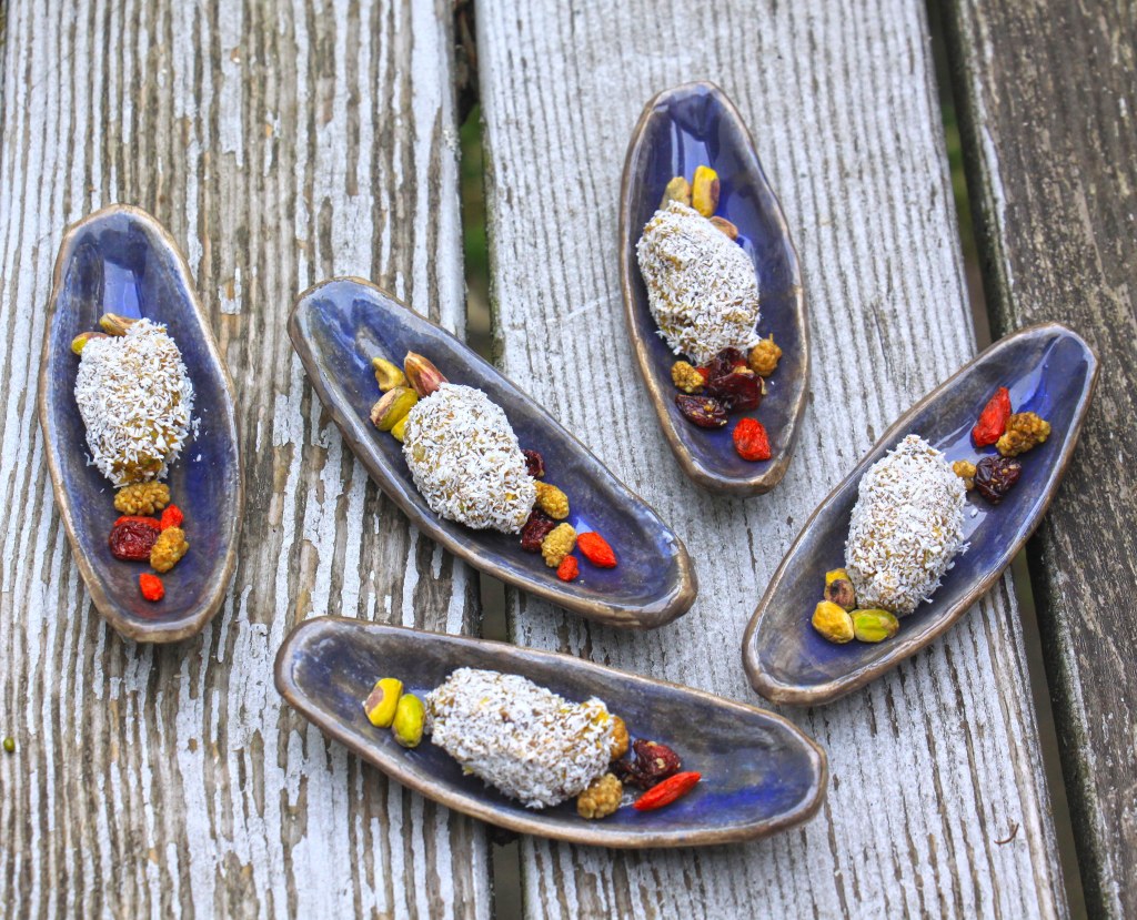 Für ca. 15 Stk.: Je 150g Datteln und getrocknete Aprikosen mit je 75g Mandeln und Pistazien fein hacken. 2 EL Hanfsamen und 3 EL Honig oder Ahornsirup mit Nüssen und Obst verrühren. Am besten in einem extrastarken Mixer (weil die Mase sehr klebrig ist), bis eine formbare Masse entsteht. Zu Kugeln rollen und diese in Sesam, Kokosflocken oder feingehackten Gojibeeren wälzen. Bis zum Vernaschen im Kühlschrank aufbewahren.