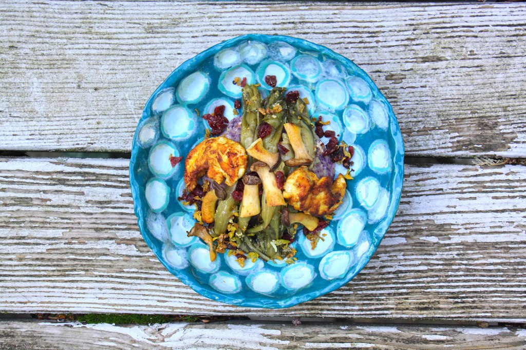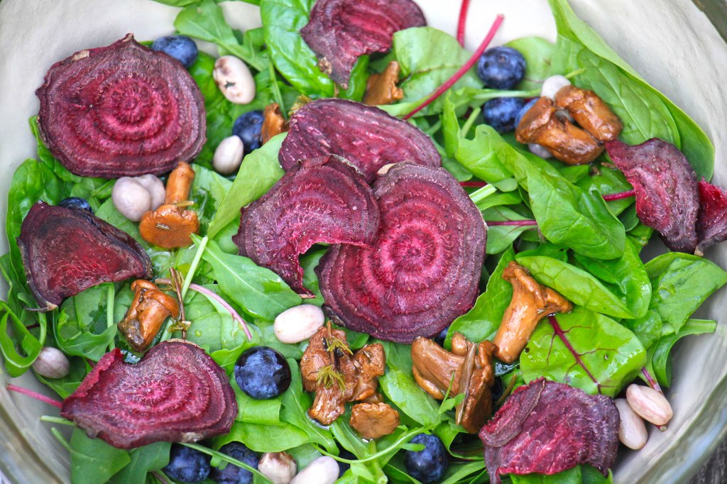 200g Pfifferlinge oder Steinpilze (große Exemplare teilen) kurz anbraten (oder eingelegte Pilze verwenden). 1 dicke Rote Bete in feine Scheiben schneiden und diese mit geräuchertem Meersalz (z.B. Salish-Alderwood von Altes Gewürzamt) einreiben mit etwas Öl beträufeln und im Backofen bei 100° ca. 1 Stunde antrocknen – im Sommer geht das auch gut in der prallen Sonne – dann sollte man allerdings 2 Stunden einplanen. 100g Walnusshälften trocken rösten und halbieren. 1 Romana-Salat waschen, die Blätter in Stücke schneiden und mit 100g verzehrfertigen dicken Bohnen (wenn die Bohen im Dampfdrucktopf gegart werden, sind sie für lektinfreie Ernährung geeignet) , 200g Heidelbeeren, 100g Rauke (ohne Stiele) sowie den Nüssen und den Pilzen mischen. Dressing darüber geben – zum Servieren die Rote Bete „Chips“ darauf anrichten. Dressing: 100ml Trüffelöl, 60ml Cidre-Essig, Salz, Pfeffer, Thymian