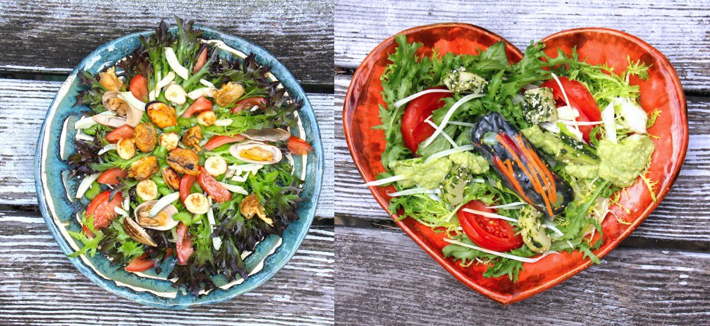 Mit Meeresfrüchten: 1–2 Knollen Fenchel fein hobeln, 1 Frisee-Salat waschen und in kleine Stücke zerteilen, 1–2 Ochsenherz-Tomaten und 3 Stangen Staudensellerie in Scheiben schneiden. Das Gemüse mischen und in eine breite Salatschüssel geben. Dressing über das Gemüse geben. 16 Teppichmuscheln (Vongole) in einem Sud aus Wein und Fenchelkraut kochen. 8 Jakobsmuscheln in Olivenöl kross anbraten und mit einem Schuss Pastis ablöschen. Die beiden Muschel-Varianten und geräucherte Austern (Dose) auf dem Salat anrichten.