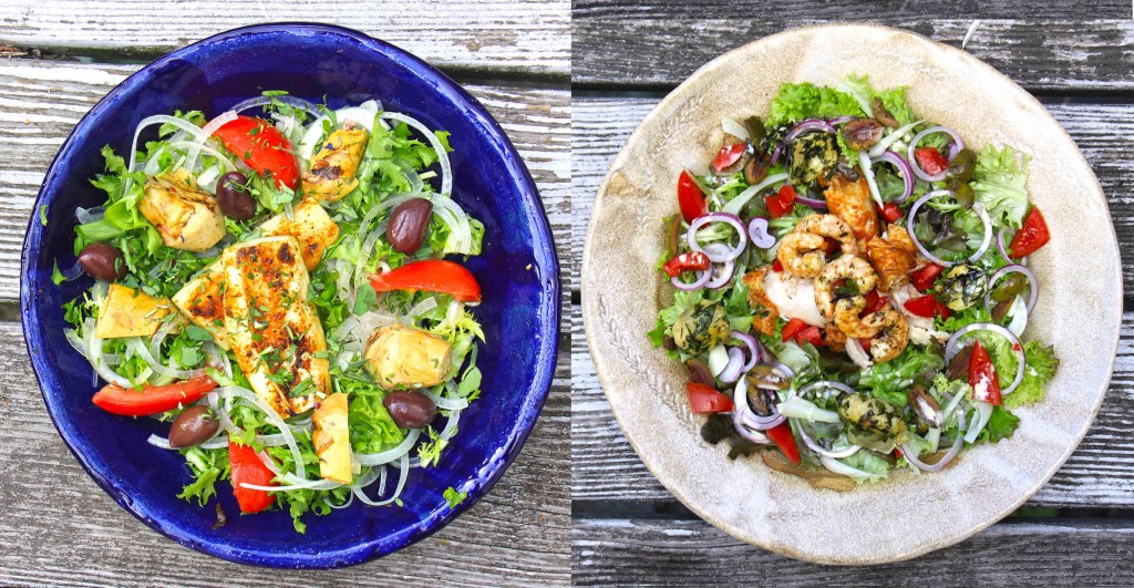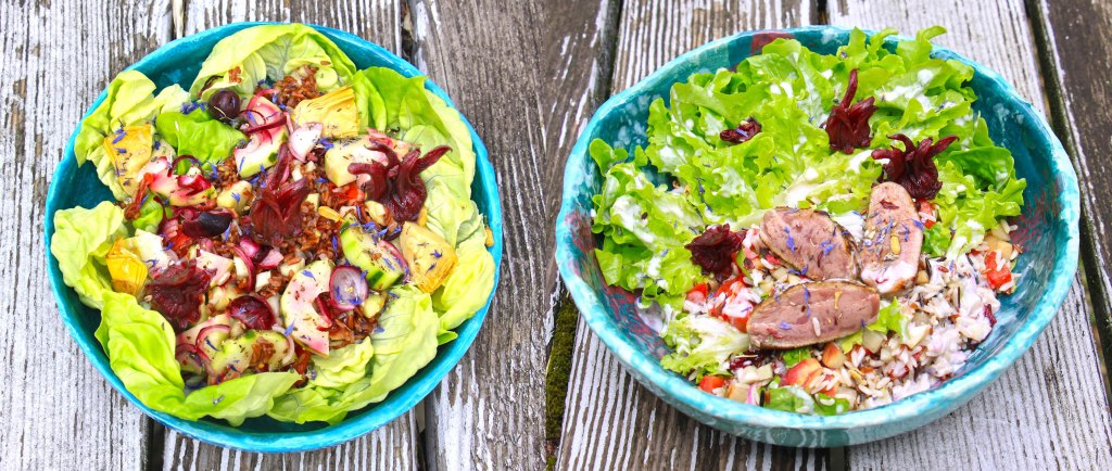 Mit Huhn, Garnelen&Roquefort: 8 Garnelen mit Knoblauch marinieren. 1 Stange Staudensellerie, 2 Tomaten (ohne Haut und Kerne) und 1 kleine Zwiebel vierteln. 2 Perlhuhn-Supreme mit den Gemüsewürfeln bedecken in eine Tajine legen. 1 Zitrone teilen und dazulegen. Salz, Knoblauch und Olivenöl darüber geben und ziehen lassen – ca. 1,5 Stunde vor dem Servieren bei 180° ca. 30 Minuten schmoren und zugedeckt bis zum Anrichten ruhen lassen – die Knochen entfernen. 4 gegrillte Artischockenherzen vierteln oder halbieren (je nach Größe), 1 große rosa Gemüsezwiebel (sind etwas süsser) halbieren und feine Ringe schneiden. 1 Stange Sellerie schneiden. 100g Oliven halbieren. 1 Lollo Rosso waschen, die Blätter in mundgerechte Stücke reißen und mit dem kalten Gemüse mischen. Garnelen kurz braten. Das Huhn und die Garnelen auf dem Salat anrichten mit frischen fein gehackten Kräutern (Oregano, Thymian, Rosmarin) bestreut servieren. 100g Roquefort in kleinen Stücken darüber geben.
