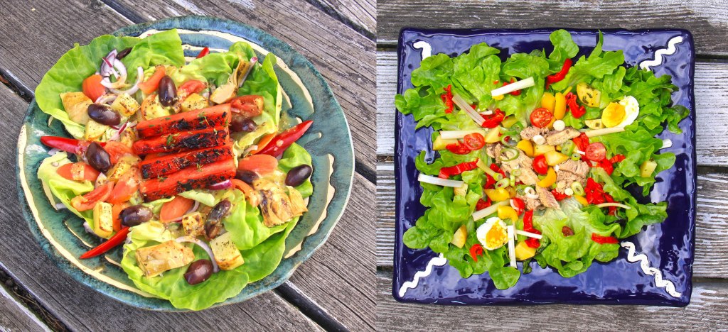 Mit Thunfisch: 3 Eier hart kochen, 2 mittelgroße Kartoffeln würfeln, mit Olivenöl, Zitrone und Salz bedecken und im Ofen bei 180° ca. 10 Minuten garen. 500g Thunfisch (Sushi-Qualität) 48 Std. vorher mit Beize (Pfeffer, brauner Zucker, Gin und Meersalz oder „Graf Lax“ von Herbaria) einreiben und luftdicht eingepackt ziehen lassen. 1 Kopf grünen Salat waschen und die Blätter etwas zerteilen – eine Salatschüssel damit auslegen; einige Blätter weglegen. 1 Salatgurke, je 1 rote und gelbe Paprika und 3 Tomaten schälen und entkernen, dann in etwas gleich große Stücke schneiden und diese mit den abgekühlten Kartoffelwürfeln, 100g Sardinen sowie 3 Frühlingszwiebeln (feine Ringe) und dem restlichen Salat mischen und in die Schüssel geben. Die Eier vierteln und den gebeizten Thunfisch in feine Scheiben schneiden, beides oben auf den Gemüsewürfeln anrichten und mit etwas Dressing übergießen.