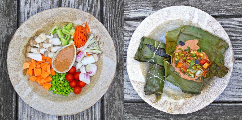 Menge für 10 Päckchen: Für die Soße 400 ml Kokosmilch mit 4 EL Currypaste, 1 EL Stärke, Saft 1 Limette und 1 EL Kokosblütenzucker einkochen. 1 Möhre, 1 kleinen Rettich und 5 Frühlingszwiebeln in feine Streifen schneiden; 30 Blatt Thai-Basilikum zupfen. Bananenblätter abwaschen und zurechtschneiden (Länge ca. 35cm/TK geht gut). Je Päckchen 150g Gemüse bereitstellen (ca. 3×3 cm Stücke) – Pilze, Jackfrucht, Aubergine, Süßkartoffel. Es ist ein schöner Einstieg, wenn sich jeder sein Päckchen selbst bestückt. Jedes Blatt mit etwas Frühlingszwiebel und Gemüsestreifen belegen, die großen Stücke darauf und mit dem Basilikum und 1 EL der Curry-Soße bedecken; das Päckchen verschließen und ca. 20 Minuten bei geschlossenem Grill oder im Backofen bei wenig Hitze grillen.