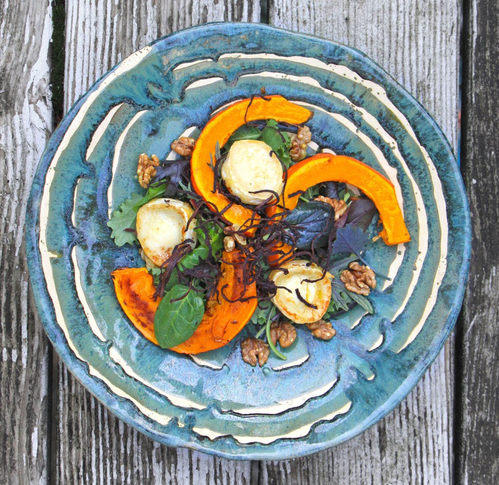 1 kleinen Hokkaido in ca. 1 cm dicke Spalten schneiden und im Backofen bräunen. 400g Feldsalat putzen und mit 200g Endivie mischen. 1 Rote Bete mit einem Julienne-Schneider fein schneiden und dieses „Stroh“ in Kokosöl frittieren; auf einem Küchenpapier abtropfen lassen. 50g Haselnüsse in der Pfanne rösten. Aus 1 EL Johannisbeer-Sirup, 3 EL Apfelessig und 2 EL Kernöl eine Vinaigrette zubereiten, die Blattsalate damit mischen. 8 Scheiben einer Ziegenkäse-Rolle (oder kleine Käsetaler) mit etwas Honig im Backofen bräunen. Den Blattsalat mit den Nüssen auf die Teller geben und mit Käse, Kürbis und Bete belegen.