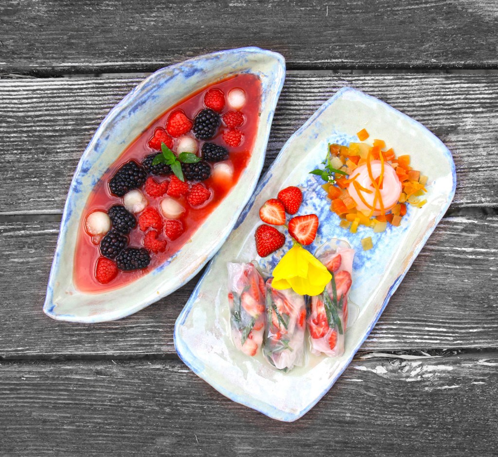 8 Blatt Reispapier auf feuchten Leinentüchern auslegen. 500g Erbeeren in Streifen oder kleine Würfel schneiden und mit 1 El Honig und dem Saft 1/2 Limette mischen. 1 Bund Basilikum (oder Minze) von den Stielen befreien, grob hacken und auf den Reispapierblättern verteilen; die Erdbeeren jeweils als Füllung in die Mitte geben und jedes Blatt zu einer festen Rolle wickeln.