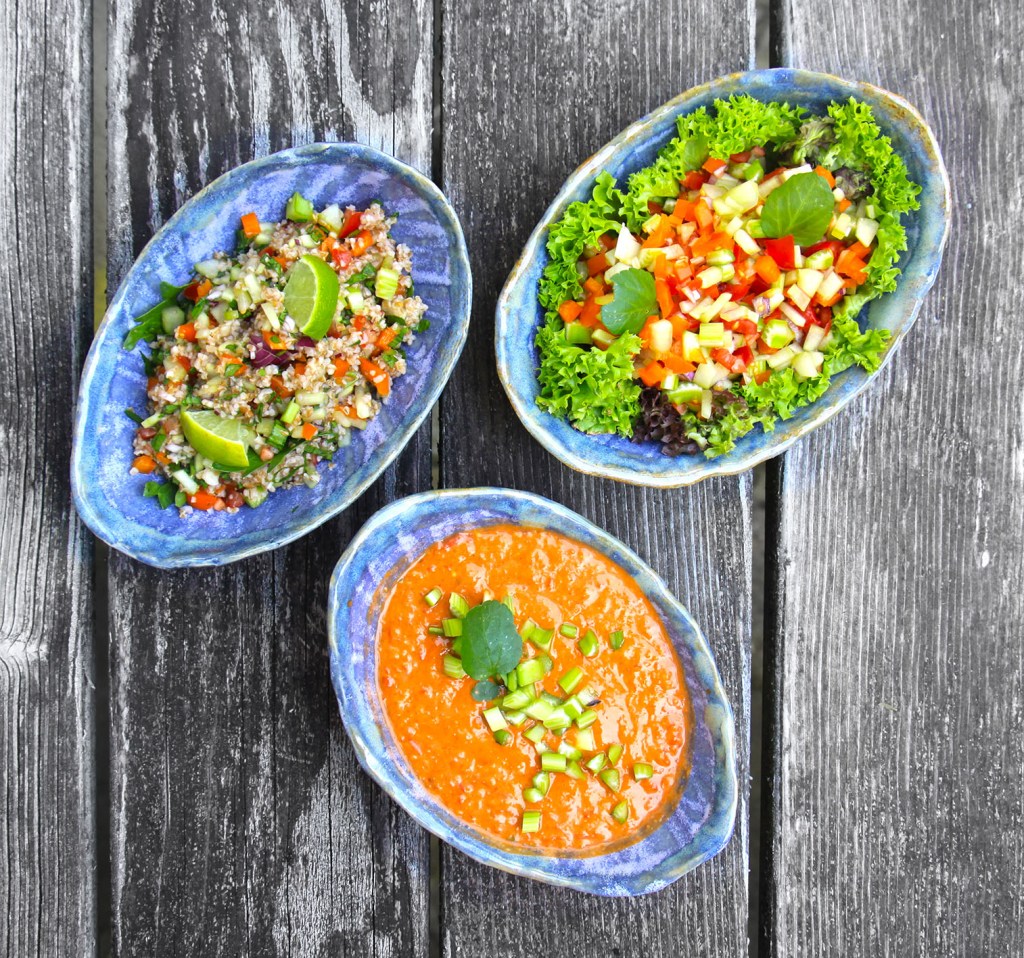 1 Salatgurke (geschält, ohne Kerne, sonst wird es zu wässrig), 2 rote Paprika und 500g Tomaten mit 6 EL Olivenöl, 1 Knoblauchzehe und 1 Scheibe Weißbrot pürieren – mit Salz und Pfeffer abschmecken – kalt servieren. Verändert die Anteile der verschiedenen Gemüse ganz nach Angebot und Geschmack. Als Einlage schmecken knusprige Brotwürfel oder noch mehr frisches (knackiges) Gemüse z.B. Fenchel, Staudensellerie oder Kohlrabi – fein gehackt.