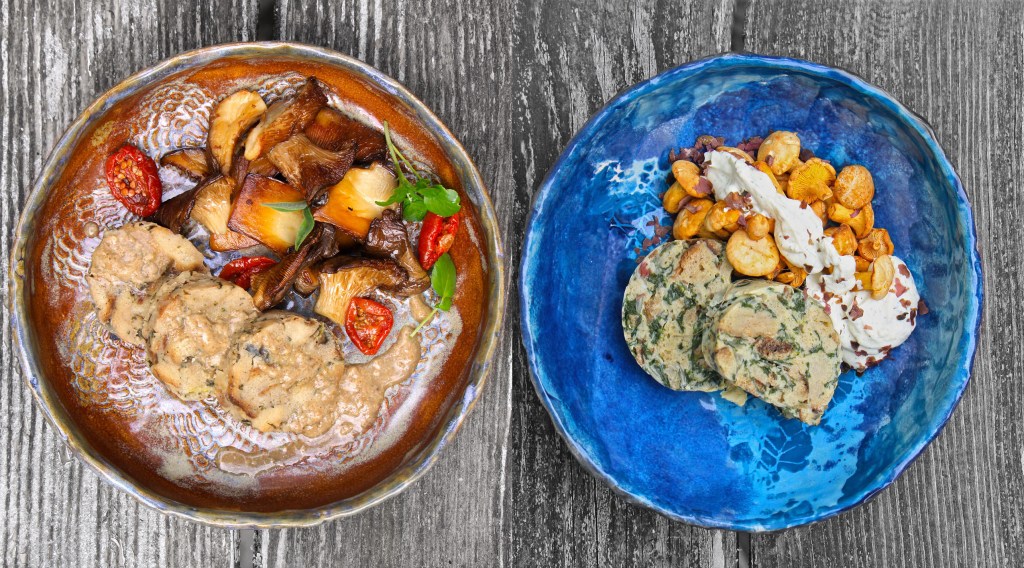 In der Zwischenzeit 800g Pilze (Steinpilze, Kräutersaitlinge, Pfifferlinge) und 4 Frühlingszwiebeln in Streifen schneiden – in Öl 10 Min. unter Rühren anbraten. Zugedeckt bei wenig Hitze 5 Min. schmoren. Pilze aus der Pfanne nehmen und nach Belieben 2–3 EL Crème fraîche in die Pfanne geben. Den Bratansatz der Pilze damit binden und die Pilze wieder dazu geben. Mit den Knödeln servieren.