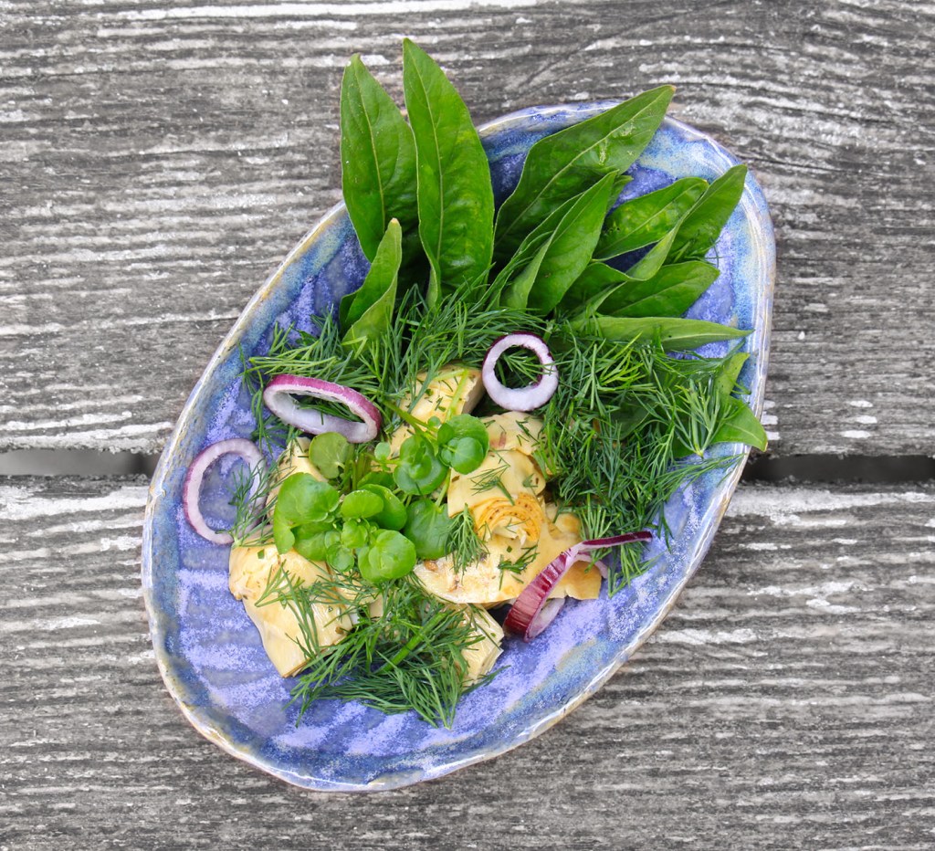 2 große Portionen: 8–12 eingelegte Artischockenherzen halbieren und auf 400g Brunnenkresse (oder jungem Spinat) anrichten. Dressing: je 1/2 Tl Koriander und Senfsamen ohne Fett anrösten und dann mörsern. 2 cm Ingwer, 2 Knoblauchzehen, 1 rote Chili und einige Zweige Dill fein hacken. Mit Saft von 2 Limetten, 4 El Olivenöl, Salz, Pfeffer und den gemörserten Gewürzen mischen. 1 kleine rote Zwiebel in feine Ringe schneiden. Das Dressing und die Zwiebelringe auf den Artischocken verteilen – fertig!