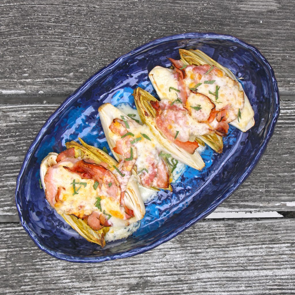 Pro Person 2 Chicoree halbieren, in eine Auflaufform legen und mit pikanten Feigensenf bestreichen – mit etwas Thymian oder Estragon bestreuen, und mit luftgetrocknetem Schinken belegen. Im Backofen bei 180° ca. 15 Minuten mit mildem Pecorino überbacken.