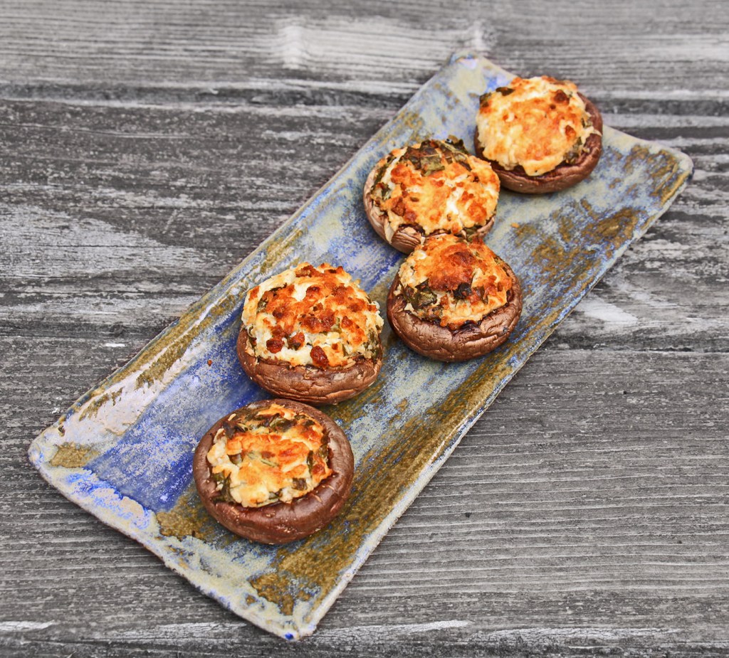 8 große Champignons putzen, Stiele und Lamellen entfernen (das geht sehr gut mit einem kleinen Kugelausstecher oder einem Teelöffel). 1 Zwiebel fein hacken mit Tomatenmark in Olivenöl anschwitzen, 100g Quinoa dazugeben, mit 100ml Gemüsebrühe aufgießen und 20 Minuten garen. 100g Ziegenfeta (geht natürlich auch mit veganer Alternativer) klein würfeln. Glatte Petersilie hacken. Beides unterrühren, kräftig würzen (Cayennepfeffer, Paprika, Salz, Knoblauch). Die Champignons mit der Masse füllen und 10 Minuten mit der Grillfunktion des Backofens bei 180° überbacken.
