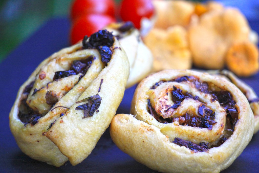500g Pfifferlinge, Austernpilze oder Steinpilze in kleine Stücke schneiden. 1 Zwiebel und 1 Knoblauchzehe und 5 getrocknete Tomaten sehr fein würfeln. 1 kleinen Bund Koriander oder glatte Petersilie fein hacken. In eine Pfanne etwas Olivenöl erhitzen die Zwiebel darin glasig barten und die Pilze, Tomaten und Kräuter dazugeben – kurz durchrühren und die Pfanne vom Herd nehemn. Abkühlen lassen. Den Hefeteig zu einem etwa backblechgroßen Rechteck ausziehen (am besten mit den Händen ohne Nudelholz, dann wird der Teig fluffiger), mit der Füllung bestreichen und mit gehobeltem Peccorino bestreuen. Aufrollen, in ca 5 cm dicke Scheiben schneiden (vorsichtig etwas platt drücken) und diese auf ein mit Backpapier ausgelegtes Blech legen und bei 180° ca. 20 Minuten backen.