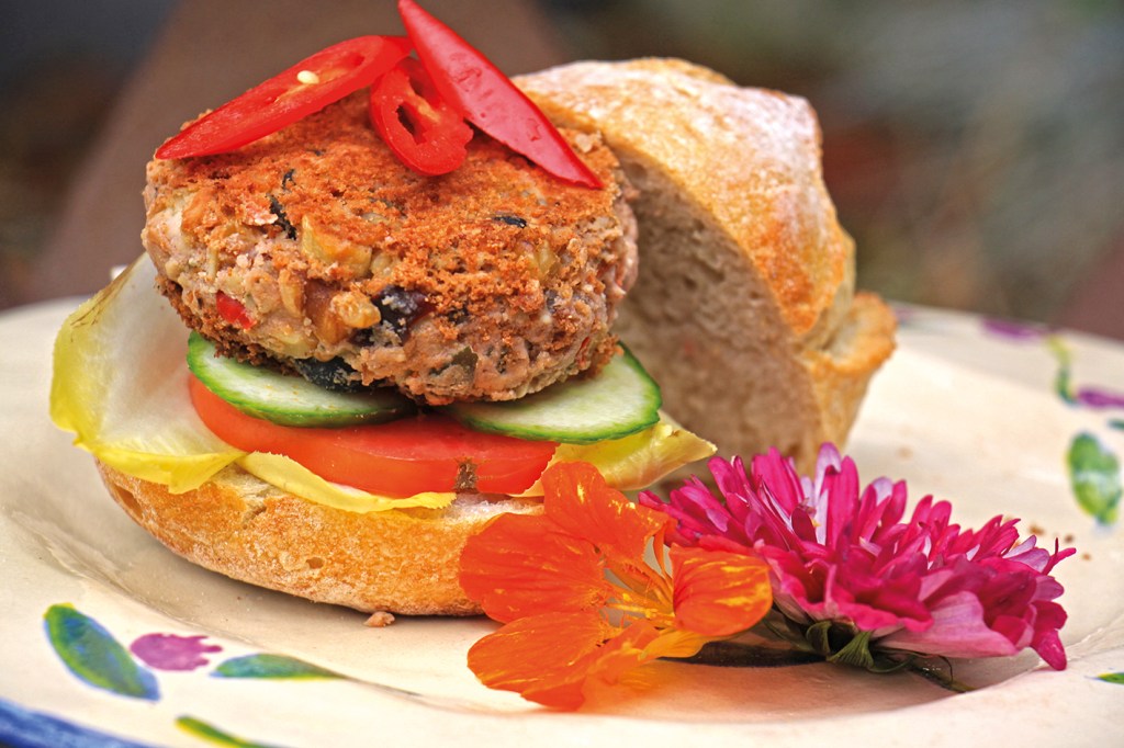 Sourcreme bestreichen – Burger drauf – mit roten Paprikastreifen