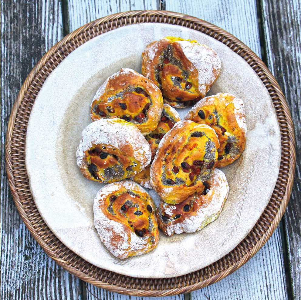 2 große Süßkartoffeln in dicken Scheiben im Backofen (ca. 1 Std. bei 160°) garen. Warm mit dem Pürierstab zu einem feinen Püree (300g) verarbeiten, mit Salz, Zimt und Muskat abschmecken und abkühlen lassen (Am Abend vorher machen). 1 Würfel Hefe mit 1 Prise Salz, 1 EL Honig und 100ml lauwarmem Wasser verrühren. 300g (Dinkel)Vollkorn-Mehl und das Püree mit der Hefe-Mischung zu einem geschmeidigen Teig kneten. Diesen Teig abgedeckt an einem warmen Ort etwa 1 Stunde gehen lassen, bis er sein Volumen in etwa verdoppelt hat. 200g Cranberries und ein Stück Zimtstange mit 1 Tasse heißem Wasser übergie.en und ziehen lassen solange der Teig geht. Den Teig zu einem ca. 1 cm dicken Rechteck ausrollen. 2 EL Ghee erhitzen und 2 TL Kurkuma darin aufl .sen und auf den Teig streichen. 2 EL Chiasamen quellen lassen und ebenfalls auf der Teigplatte verteilen. Die eingeweichten Beeren abgießen und auf der Teigplatte verteilen. Diese nun aufrollen in 5 Scheiben schneiden und bei 200° ca. 15 Minuten backen.
