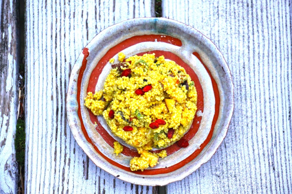 300g Couscous mit ca. 250ml kochender Milch* übergießen bis er bedeckt ist (ca. 250ml) und 10 Minuten quellen lassen. In dieser Zeit je 1 Apfel, Birne, Banane und Kiwi (oder Papaya) schneiden. Das Couscous mit je 1/2 TL Kurkuma, Zimt und Mangopulver