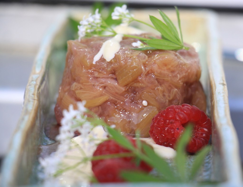 Von einem Bund Waldmeister die Blättchen abzupfen und diese in 50ml Leuterzucker (Zucker und Wasser in gleicher Menge) aufkochen und ziehen lassen (am Besten über Nacht) – dann abseien. 500g Rhabarber schälen und in 100 ml Rosé-Sekt mit dem Waldmeistersirup in einem geschlossenen Schmortopf im Ofen bei 180° ca. 25 Minuten schmoren. In 100 ml Rosé-Sekt Agar-Agar für 1l aufkochen und mit dem Kompott mischen. In Gläschen füllen. Mit Vanillesosse und frischen Beeren servieren.