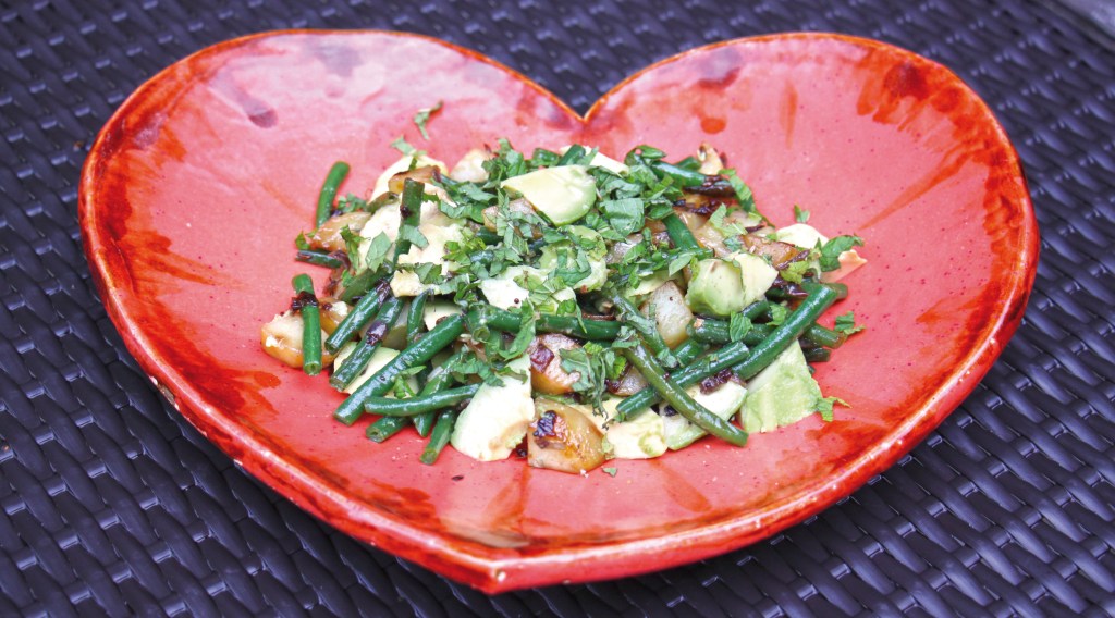 250g Grüne Bohnen in kochendes Salzwasser geben und ca. 1 Minute kochen – in eiskaltes Wasser legen – halbieren. 4 mittelgroße festkochende Kartoffeln schälen, in ca. 1 cm große Würfel schneiden – in einer Pfanne Ghee erhitzen, je 1 Tl Bockshornklee, Kreuzkümmel und Senfsamen hineingeben, bis die Samen anfangen aufzuspringen – 1 Zwiebel (klein gewürfelt) und die Kartoffelwürfel zugeben und bei geschlossenem Deckel ca. 10 Minuten schmoren – den Pfanneninhalt über die Bohnen giessen. 1 Avocado würfeln, mit den Bohnen und Kartoffeln mischen, mit Salz und frisch gehackter Minze abschmecken.